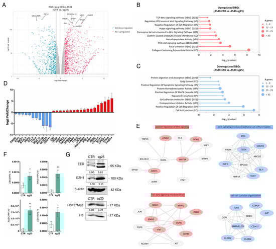 CRISPR/Cas9 targeting of the EZH2 gene induces expression of EZH1 and other PRC1 genes. (A) Volcano plot showing 630 downregulated and 857 upregulated DEGs selected to proceed with functional gene annotation (Enrichr). (B,C) Gene ontology analysis of differentially expressed genes (DEGs) in A549-sg25 cells. (D) Fold change in expression of epithelial and mesenchymal markers, and PRC1/2 constituent genes. (E) Functional enrichment of upregulated DEGs (red) and downregulated DEGs (blue) showing a protein–protein interactions network. Arrows represent hierarchical regulatory relationships between nodes, indicating up-stream or downstream interactions (F) Gene expression analysis of genes constituting PRC1/2 complexes. Gene expression was normalized using RPL19. (G) Western blot of EED, EZH1, and H3K27Me3 in A549-sg25 compared with A549-CTR cells. Expression was normalized using β-actin. Data are expressed as mean ± SD (n = 3); *, p < 0.05; **, p < 0.01 vs. A549-CTR. BP, biological process; CC, cellular component; MF, molecular function; KEGG, Kyoto Encyclopedia of Genes and Genomes. Log2 (fold-change) value: ±1.
