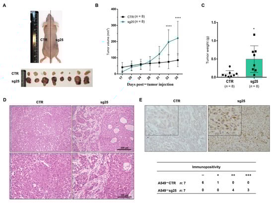 For tumor xenografts, 2 × 106 A549-CTR and A549-sg25 cells were suspended in cold PBS and mixed at a 1:1 ratio with Geltrex™ Matrix (Gibco) to a final volume of 100 µL. Each mixture was injected subcutaneously into opposite flanks of nude mice (n = 8), with A549-CTR on the left and A549-sg25 on the right side. Tumor progression was monitored for 35 days, and tumor volume (V) was determined using caliper measurements of length (L) and width (W) according to the formula V = (L × W2)/2.