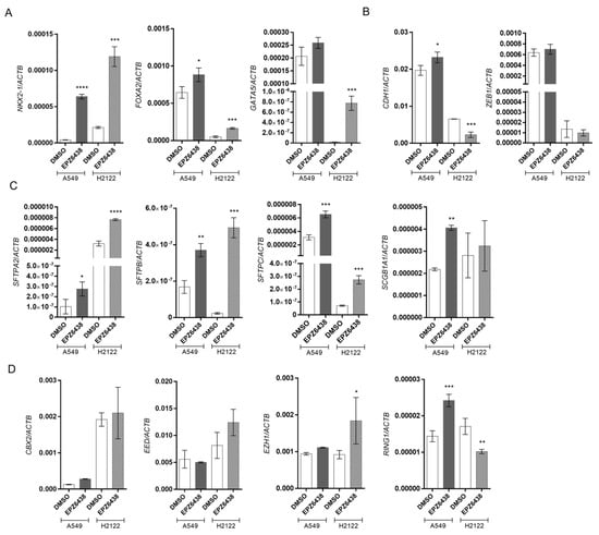 Pharmacological blockades of EZH2 activity induce differentiation into the A549 and H2122 cell lines. (A) RT-qPCR analysis of gene expression of transcription factors NKX2-1, GATA5, and FOXA2. (B) Gene expression analysis of mesenchymal transcription factors ZEB1/2 and the epithelial gene CDH1. (C) Genes encoding lung surfactants SFTPA2, SFTPB, SFTPC, and SCGB1A1. (D) Gene expression analysis of genes constituting PRC1/2 complexes. Gene expressions were normalized using ACTB. A549 and H2122 cells were treated with 5.0 µM EPZ6438 for 6 days. DMSO was used as control. Data are expressed as mean ± SD (n = 3); *, p < 0.05; **, p < 0.01; ***, p < 0.001; ****, p < 0.0001 vs. DSMO.