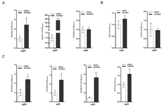 Total RNA was isolated and extracted according to the TRIzol protocol (Invitrogen) and proceeded as previously described [18]. To assess the expression of protein-coding genes, the cDNA was obtained using 1–3 µg of total RNA, oligo-dT primer, random primer, and MMLV reverse transcriptase (Invitrogen), following DNase treatment (Sigma). The expression of PRC2 components, lung differentiation genes and transcription factors, and EMT markers was analyzed by quantitative PCR (qPCR) using SYBR Green Master Mix, cDNA, and specific primers (Supplementary Table S2) on a ViiA7® Sequence Detection System (Applied Biosystems, Thermo Fisher Scientific, Waltham, MA, USA). Gene expression was normalized by comparison with ACTB levels and calculated using the QGene program v.1 [20] using the Ct values.