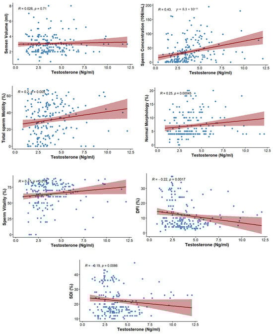 Scatterplots depicting the correlations between testosterone levels and sperm parameters, including DFI, SDI, and conventional semen parameters.