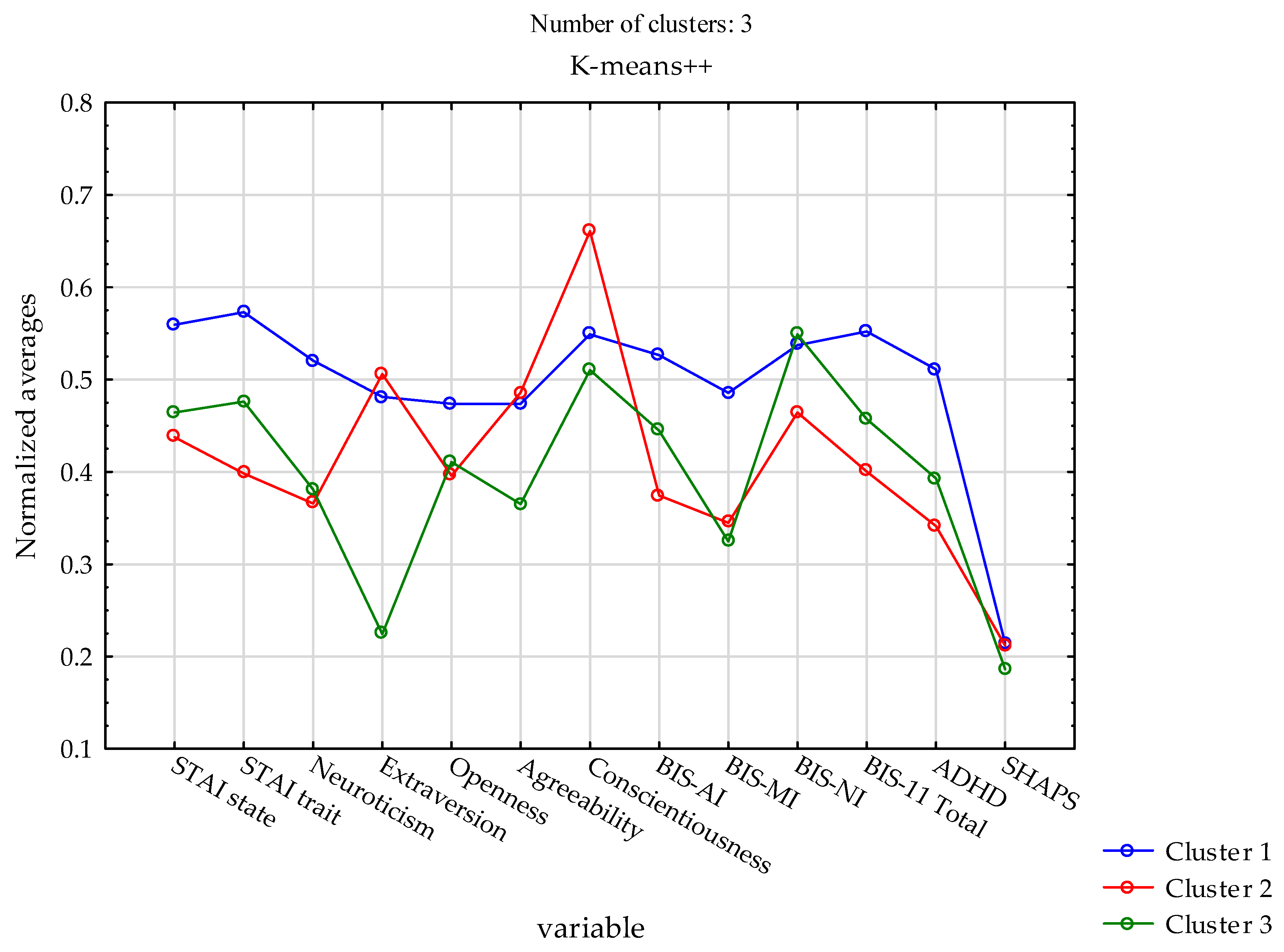Following cluster assignment, differences between clusters in quantitative variables were examined using one-way analysis of variance (ANOVA). Effect sizes were reported as η2 (eta squared), indicating the proportion of variance explained by cluster membership. Differences in genotype frequencies across clusters were assessed using the chi-square (χ2) test of independence. To control the type I error for the STAI, NEO-FFI, BIS-11, ADHD, and SHAPS tests, a Bonferroni correction was applied, adjusting the significance level to α = 0.0038 (0.05/13). To control the type I error for comparisons of analyzed gene polymorphisms, the Bonferroni correction was applied, adjusting the significance level to α = 0.00625 (0.05/8). All tests were two-tailed, and statistical significance was interpreted at p < 0.05 unless otherwise specified by Bonferroni-adjusted thresholds.