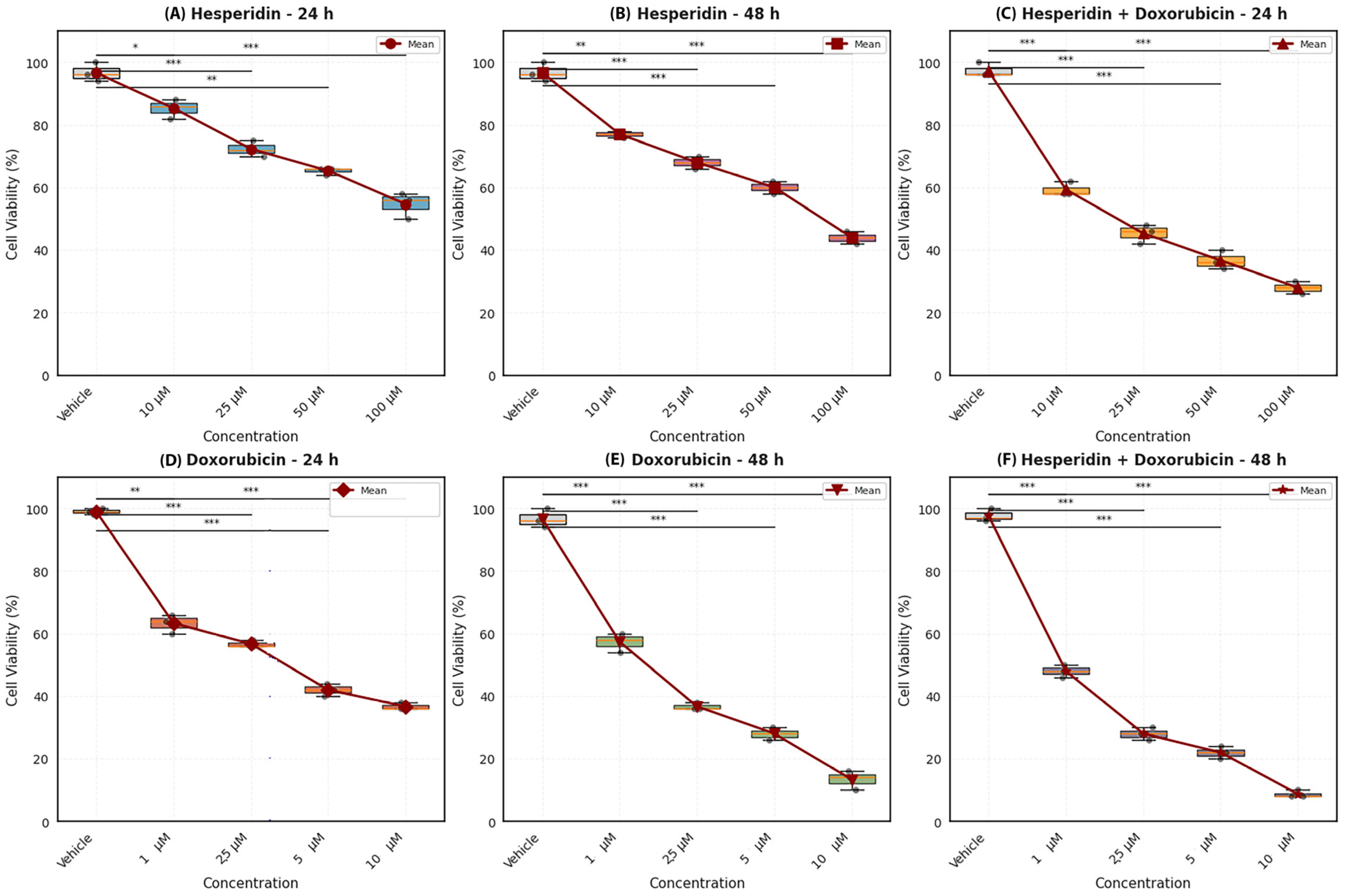 CI analysis was performed to quantitatively evaluate the interaction between Hes and DOX following 48 h of co-treatment. CI values were calculated based on the Chou–Talalay method using dose effect data obtained from the MTT assay. Drug combinations were tested at fixed ratios corresponding to low (Hes 12.5 µM + DOX 1.25 µM), medium (Hes 25 µM + DOX 2.5 µM), and high (Hes 50 µM + DOX 5 µM) dose levels. CI values were interpreted as follows: CI < 1 indicated a greater-than-additive interaction, CI = 1 indicated an additive effect, and CI > 1 indicated an antagonistic interaction. CI calculations were performed using GraphPad Prism version 9.0 (GraphPad Software, San Diego, CA, USA) based on mean viability values derived from at least three independent biological experiments.