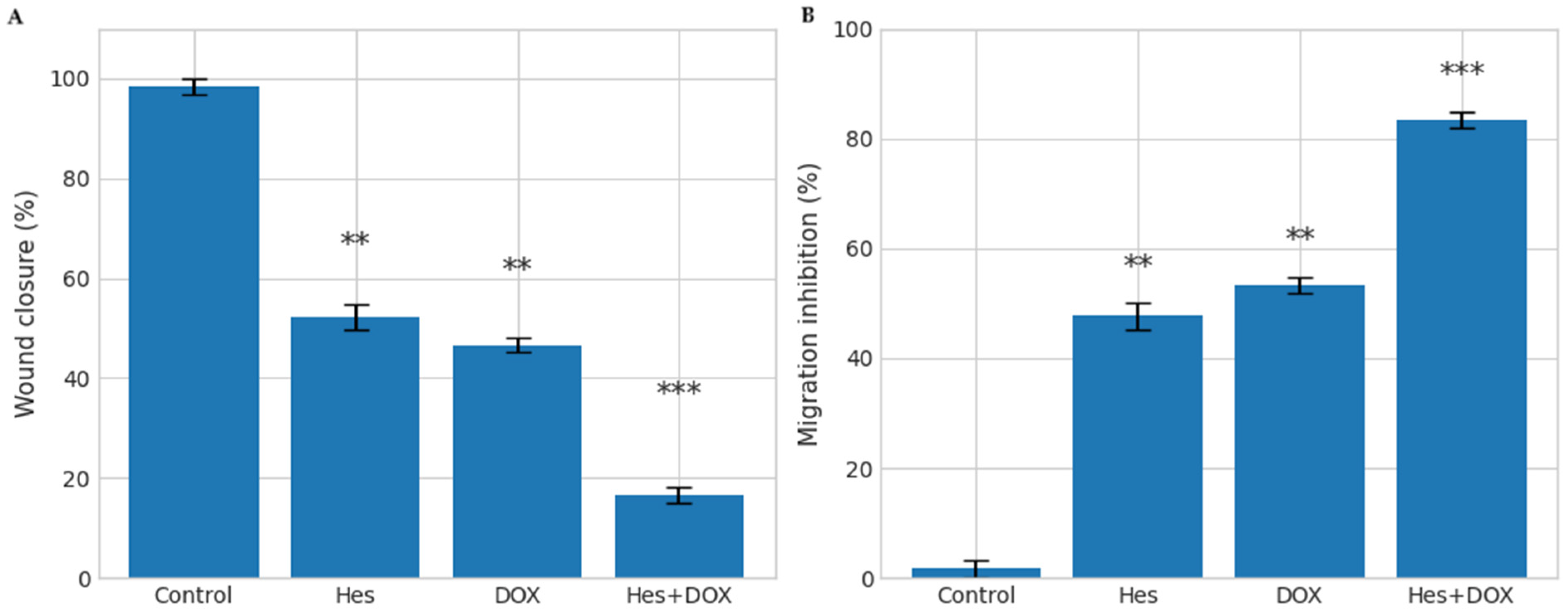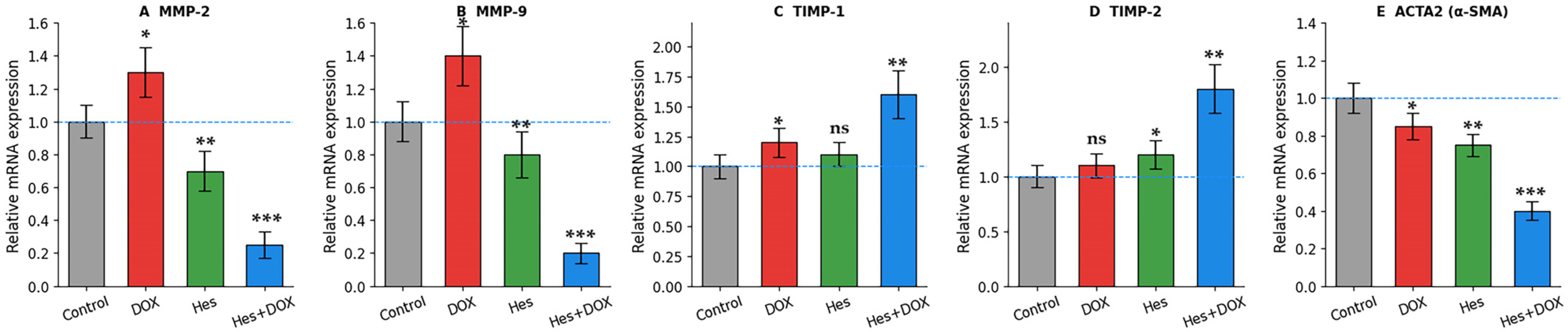 The enhanced cellular response induced by combination treatment was further reflected in migration assays. While Hes and DOX individually reduced wound closure, their combination resulted in near-complete suppression of two-dimensional collective cell migration under in vitro conditions. This phenotypic inhibition was accompanied by coordinated transcriptional downregulation of MMP-2 and MMP-9 together with upregulation of their endogenous inhibitors TIMP-1 and TIMP-2, suggesting reduced ECM-degrading capacity. Suppression of ACTA2 expression is consistent with the observed inhibition of cell migration [
