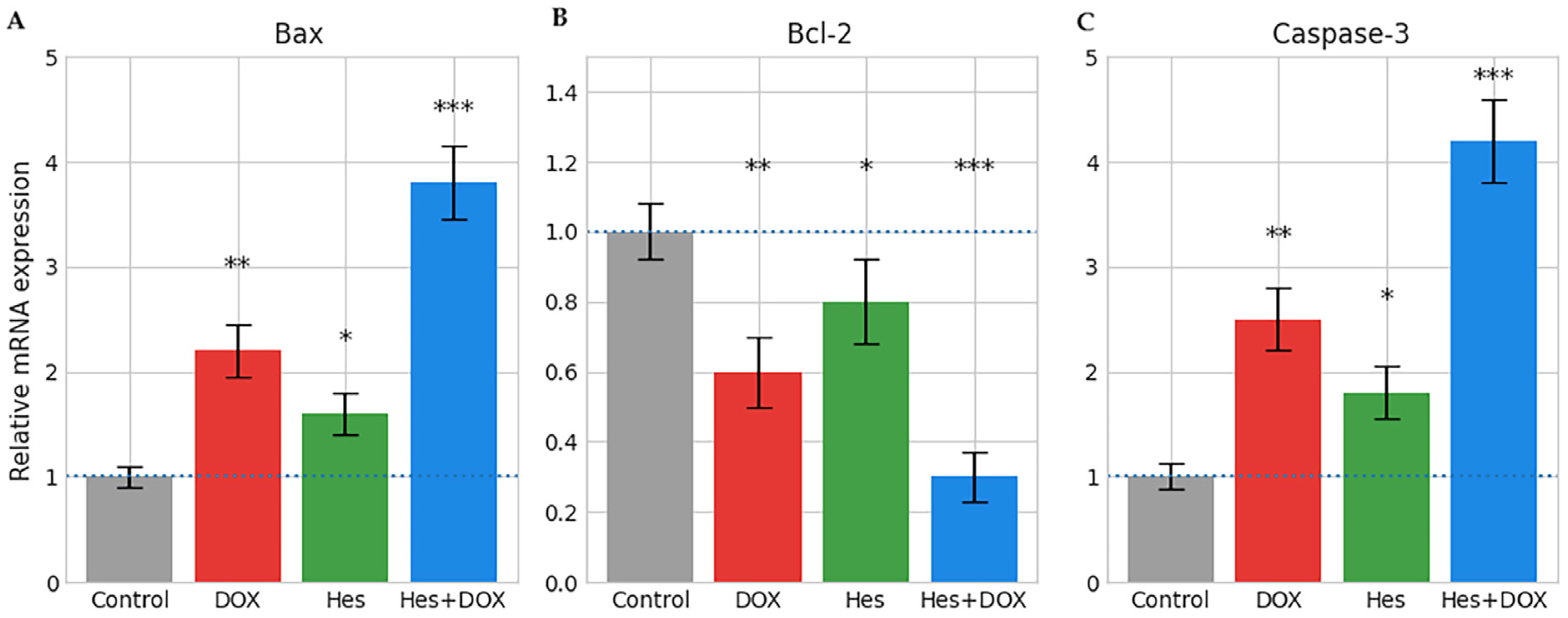 At the apoptotic level, combination treatment promoted a pronounced shift toward pro-apoptotic signaling. Increased Bax expression, concomitant suppression of Bcl-2, and upregulation of Caspase-3 collectively indicate engagement of intrinsic apoptosis-related pathways [