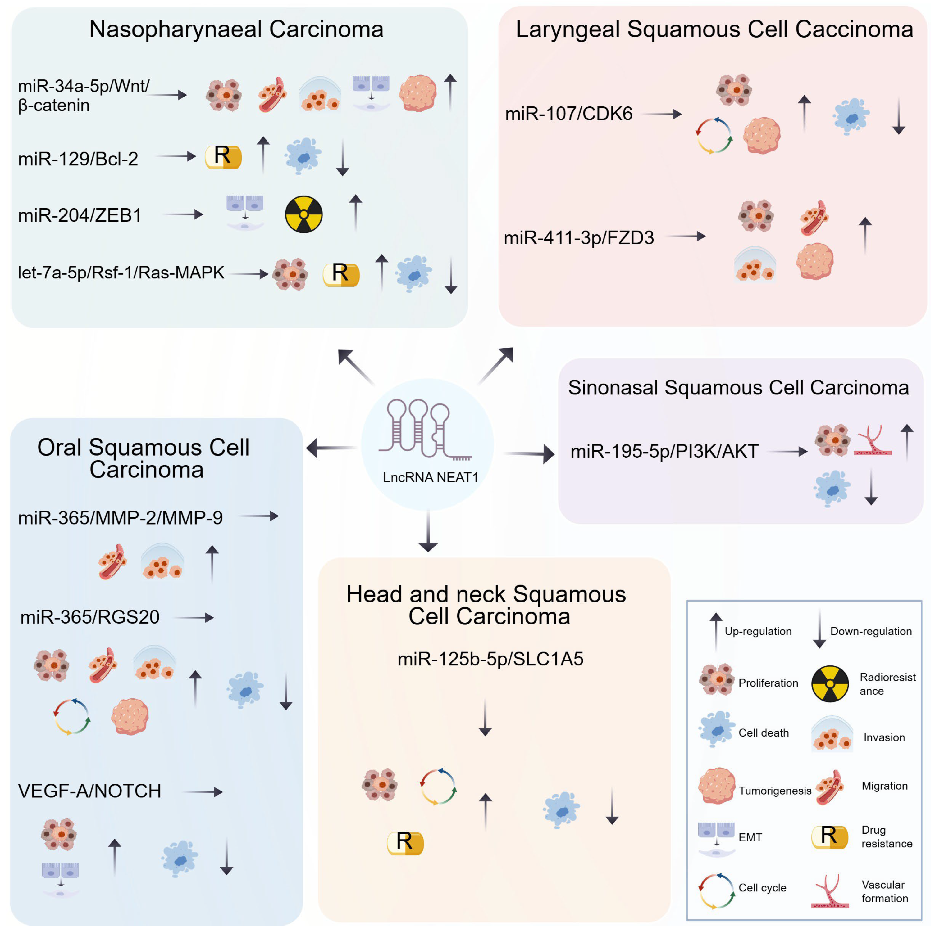 - Lu, H.; Kang, F. Down-regulating NEAT1 inhibited the viability and vasculogenic mimicry formation of sinonasal squamous cell carcinoma cells via miR-195-5p/VEGFA axis. Biosci. Rep. 2020, 40, BSR20201373. [Google Scholar] [CrossRef]