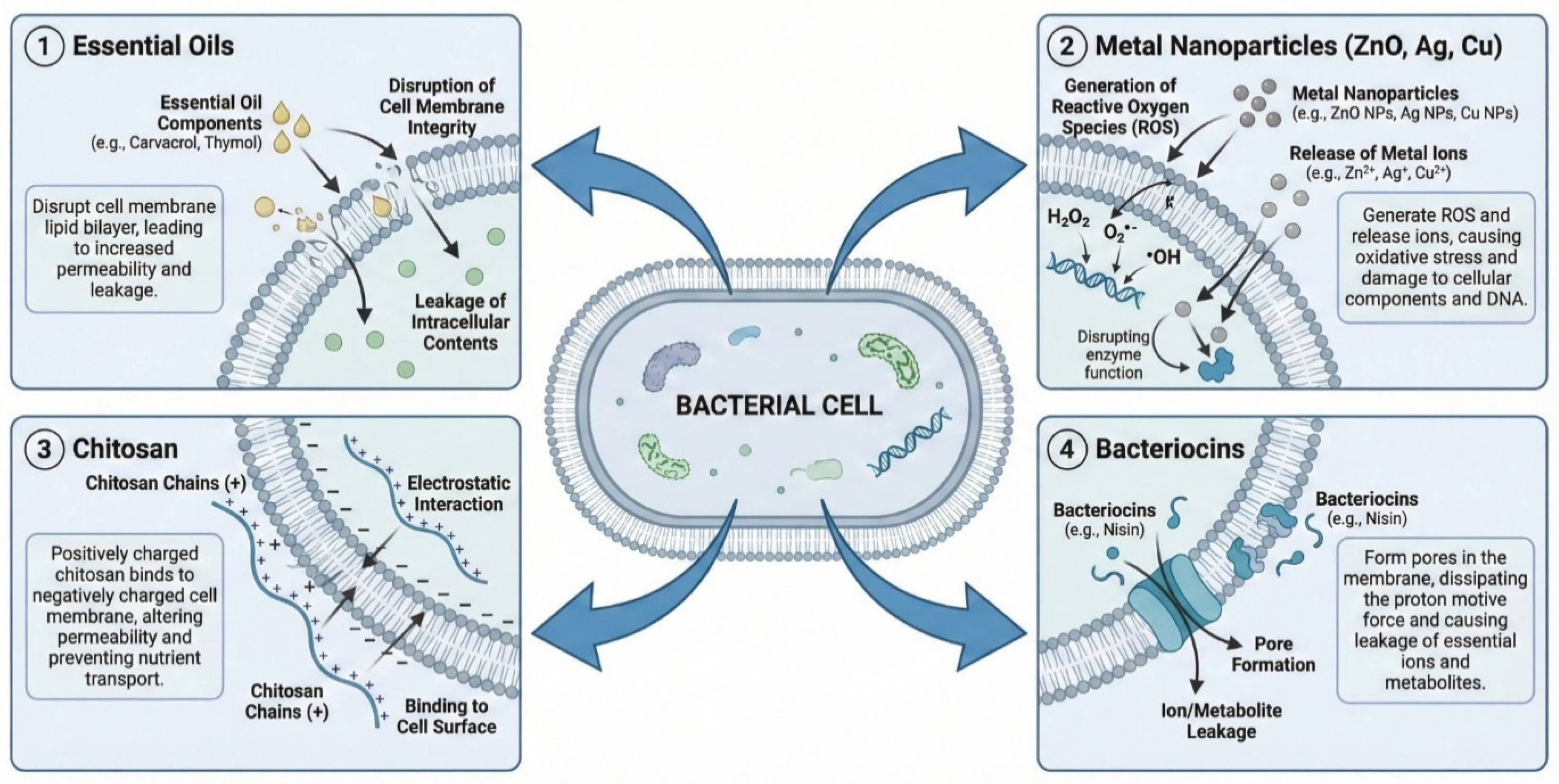 - Spore-forming bacteria: Bacteriophage-based packaging and metal nanoparticles (e.g., ZnO, Ag, Cu) incorporated into biopolymer films show activity against spore-forming bacteria such as Bacillus spp. and Clostridium botulinum. Chitosan-based and cellulose-based films with essential oils or metal nanoparticles inhibit Bacillus cereus and other spore-formers in meat and dairy products, though efficacy may depend on the food matrix and environmental conditions [84,102].
