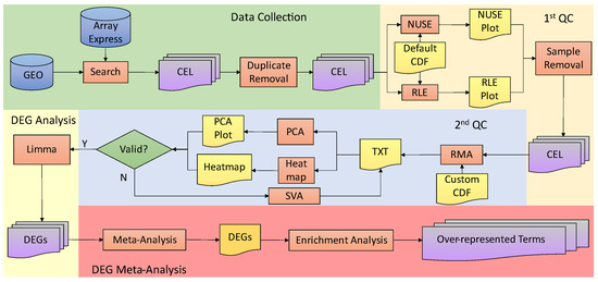 Differential gene expression analysis workflow. Data collection (from GEO and ArrayExpress), quality control of each sample in each study (NUSE and RLE), pre-processing, which includes normalization with the Robust Multi-array Average (RMA) algorithm and batch effect correction (SVA), differential gene expression analysis using the limma package, and implementation of meta-analysis by the generation of the final list. This list is used for biological term enrichment analysis.