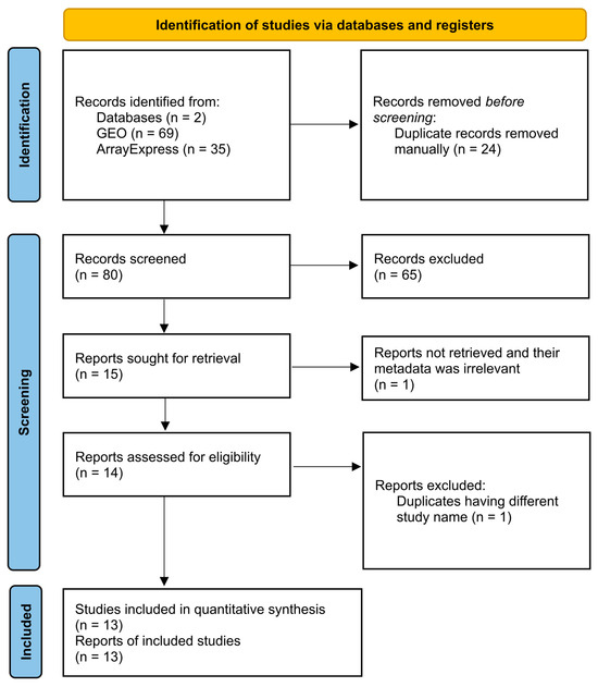 Data selection was performed following the PRISMA 2020 guidelines (Figure 2). The ArrayExpress search resulted in 35 studies, and the GEO search resulted in 69 studies. Out of those 104 studies, 24 ArrayExpress studies were excluded, as they were found to be duplicates of GEO studies. Out of the 80 remaining studies, 65 were removed by reading the title and abstract. Out of the 15 remaining studies, GSE28146 [60] was excluded after screening the meta-data, as the samples were stored in paraffin blocks, and GSE37264 [61] was removed as it was a duplicate of GSE37263 [62]. Finally, the following 13 studies were included: GSE39420 [63], GSE48350 [64], GSE36980 [65], GSE26972 [66], GSE37263 [62], GSE16759 [67], E-MEXP-2280 [68], GSE12685 [69], GSE1297 [70], GSE93885 [71], GSE195872 [72], GSE150696 [73], and GSE5281 [74,75] (Table S2).
