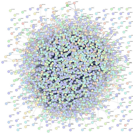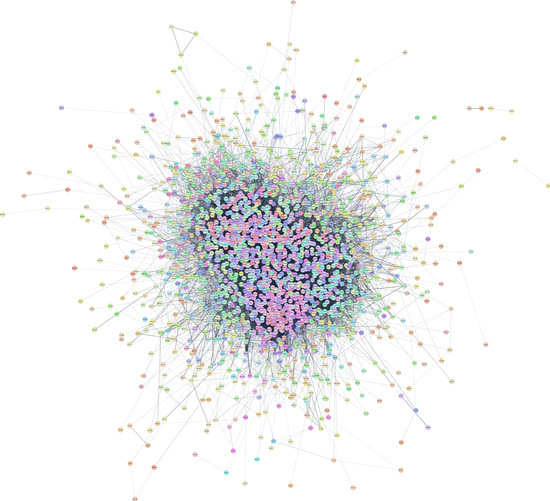 Furthermore, the resulting STRING-based PPI network in Cytoscape (Figure 4) had 2217 protein nodes with 24,958 edges between them. The hub protein of this network was GAPDH (Glyceraldehyde-3-Phosphate Dehydrogenase) (Data S4), which encodes for an enzyme essential for glycolysis. Built-in STRING enrichment analysis similarly showcased identical biological terms to those shown as enriched by WebGestalt.