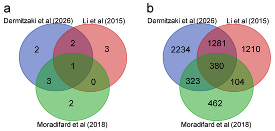 Comparison between this study and two previous microarray-based meta-analyses of AD patient brain samples [119,120]. (a) Common studies between the three meta-analyses; (b) common DEGs of the three meta-analyses.