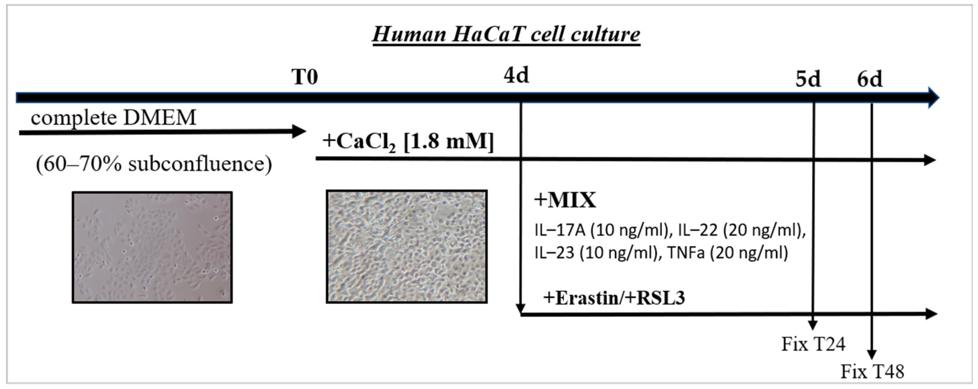 - Colombo, I.; Sangiovanni, E.; Maggio, R.; Mattozzi, C.; Zava, S.; Corbett, Y.; Fumagalli, M.; Carlino, C.; Corsetto, P.A.; Scaccabarozzi, D.; et al. HaCaT Cells as a Reliable In Vitro Differentiation Model to Dissect the Inflammatory/Repair Response of Human Keratinocytes. Mediators Inflamm. 2017, 2017, 7435621. [Google Scholar] [CrossRef] [PubMed]