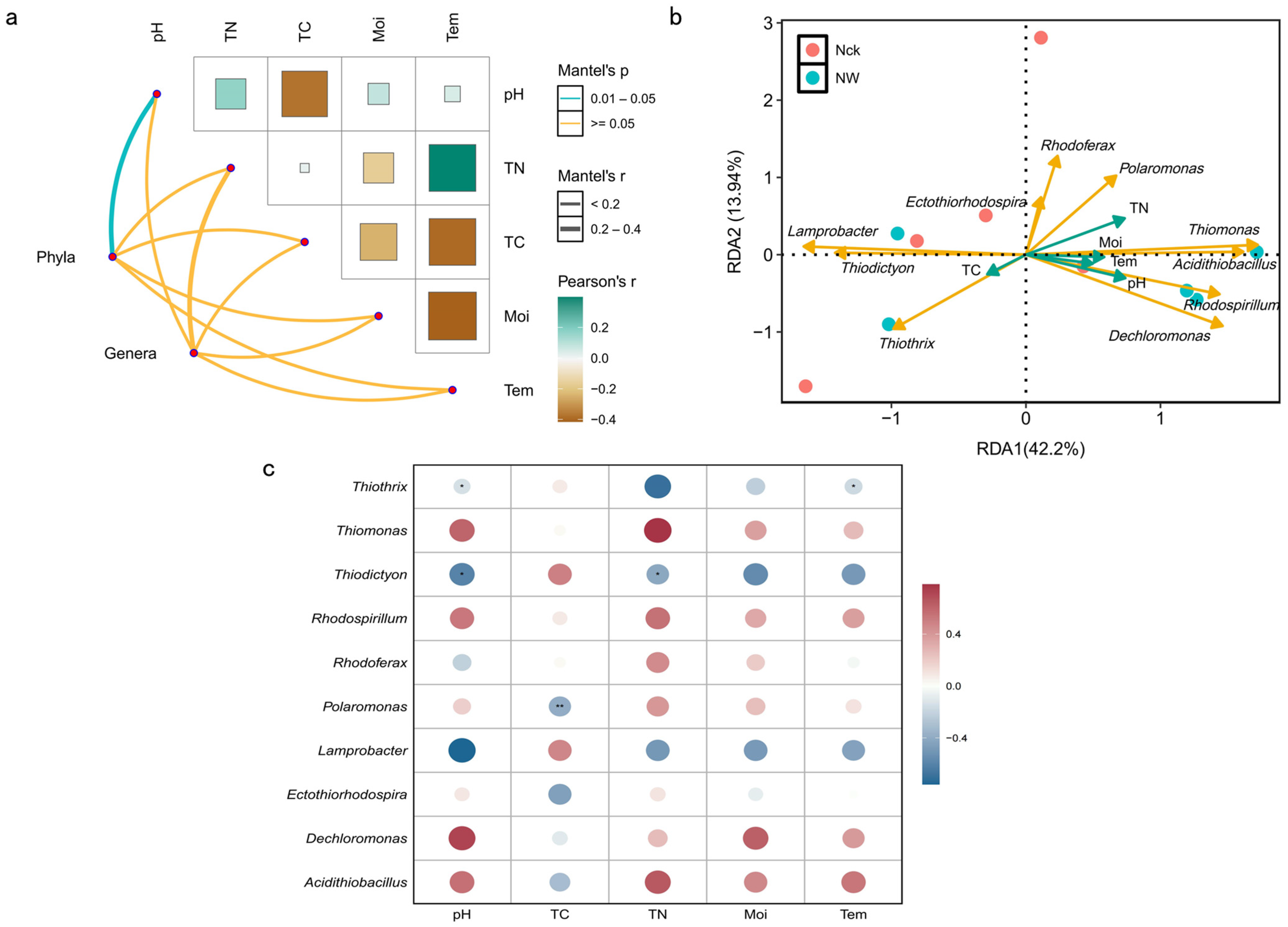 - Wang, Y.J.; Dong, J.Y.; Liu, X.K.; Li, C.C.; Zhao, Y.K.; Wang, Y.; Liu, J. Plants decrease network complexity and increase environmental stability of microbial communities, shifting the dominant environmental controls from carbon-related factors to pH in newly formed wetlands. Water 2025, 17, 3054. [Google Scholar] [CrossRef]