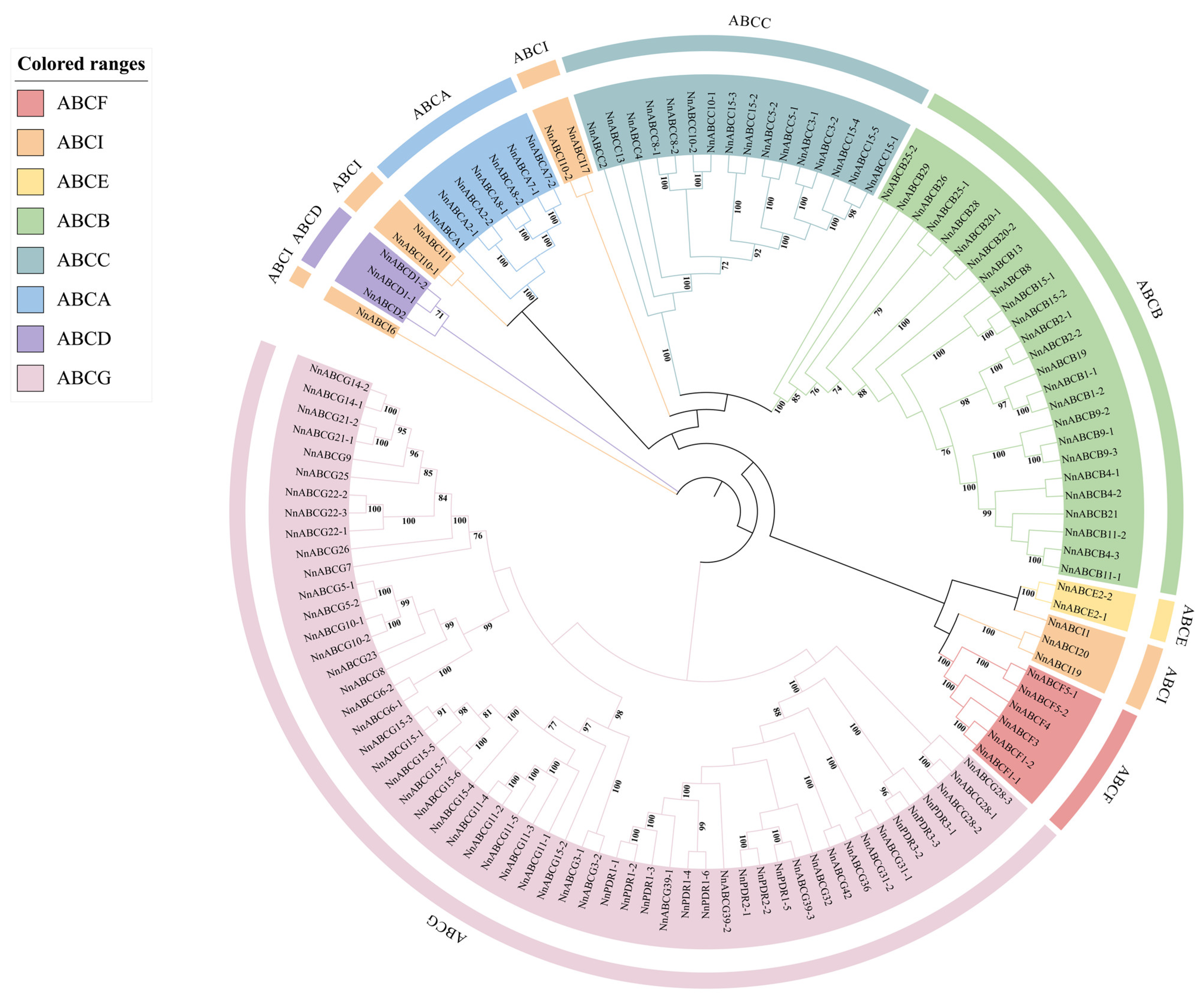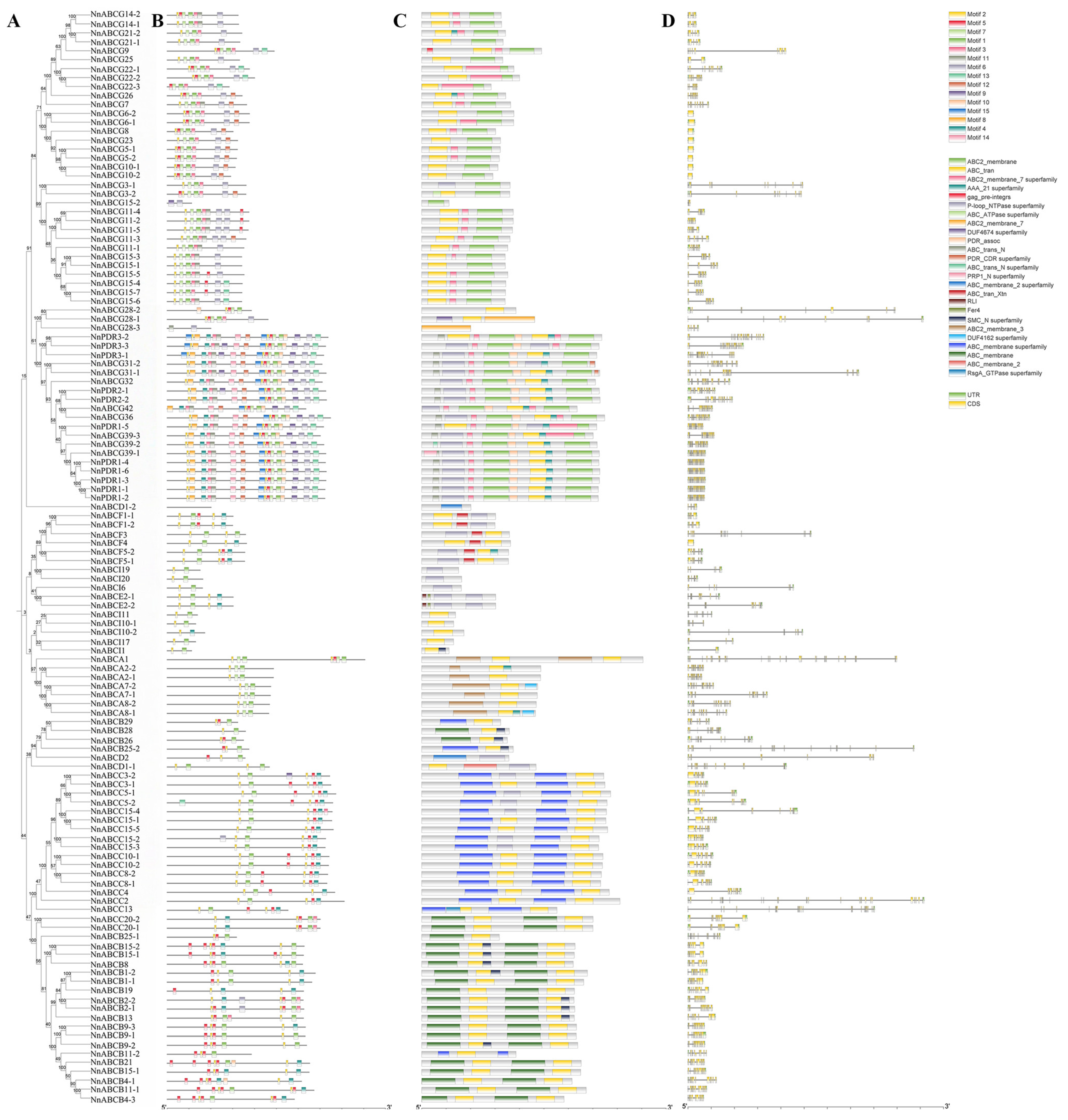 3.2. Phylogenetic Analysis of NnABC Transporter Family