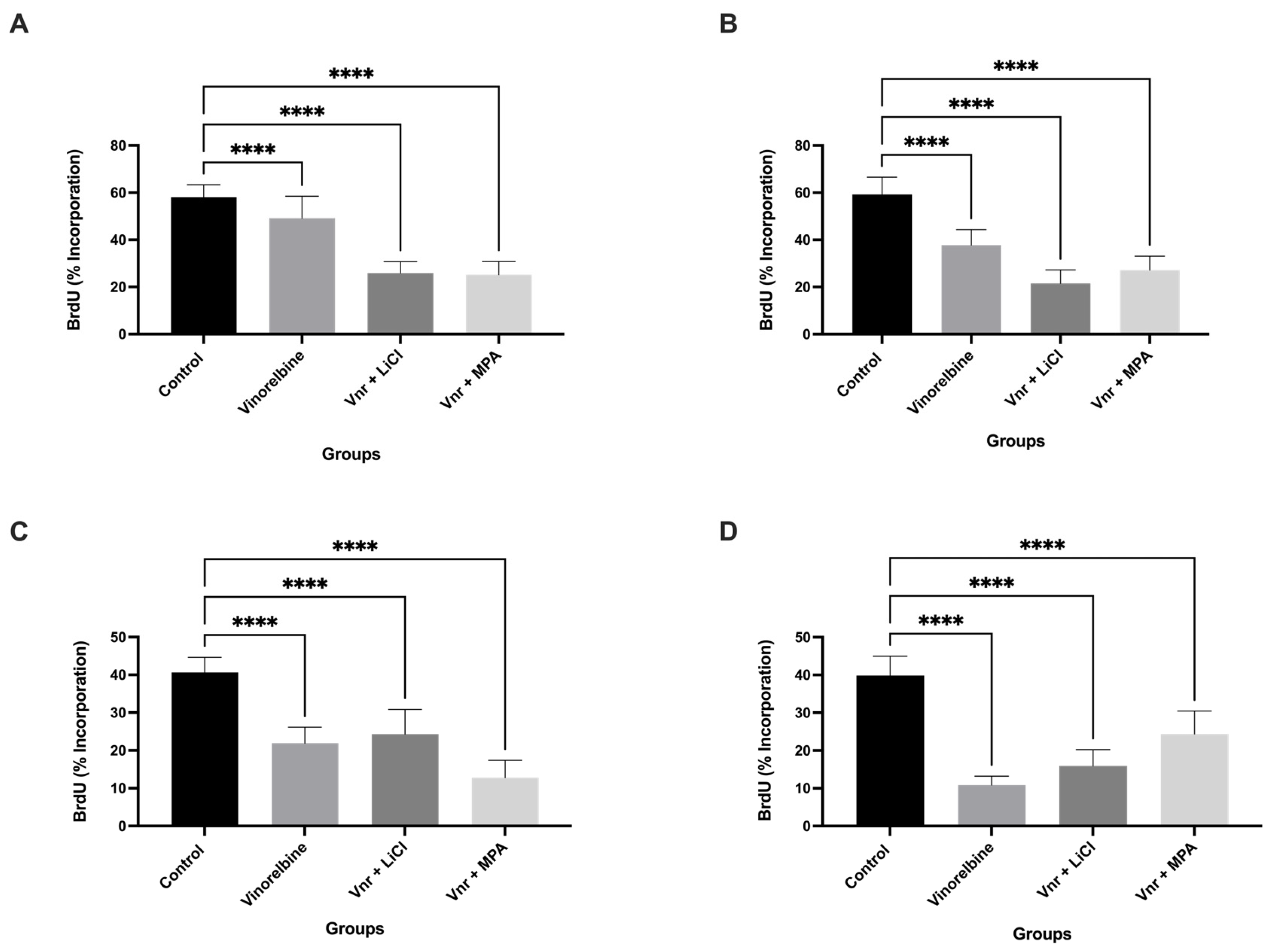 Figure 1B,C), BrdU incorporation was markedly reduced across all treatment groups, with combination treatments generally showing stronger suppression compared to vinorelbine alone. However, the extent of reduction varied between LiCl and MPA combinations depending on the time point. By 96 h (