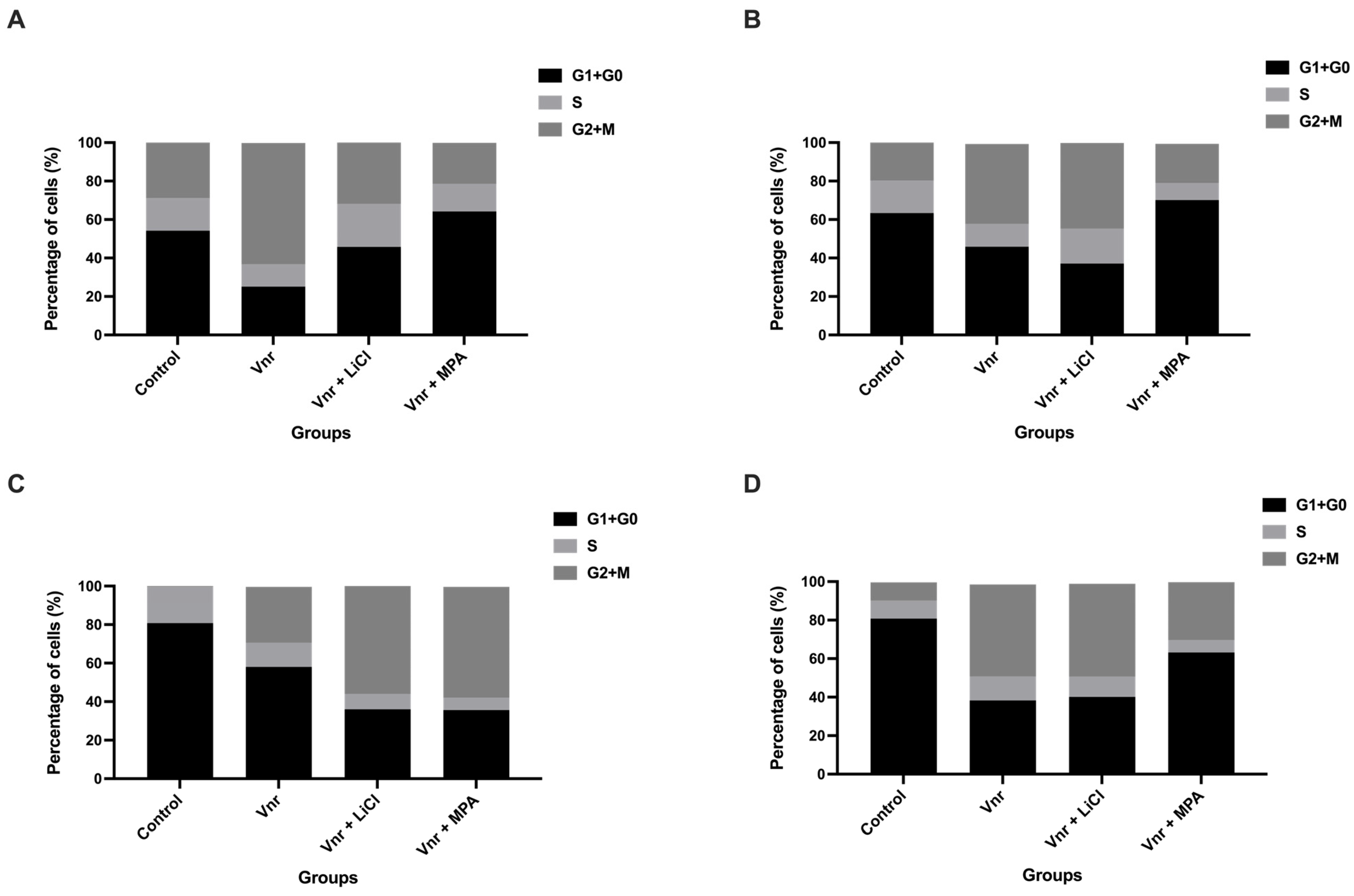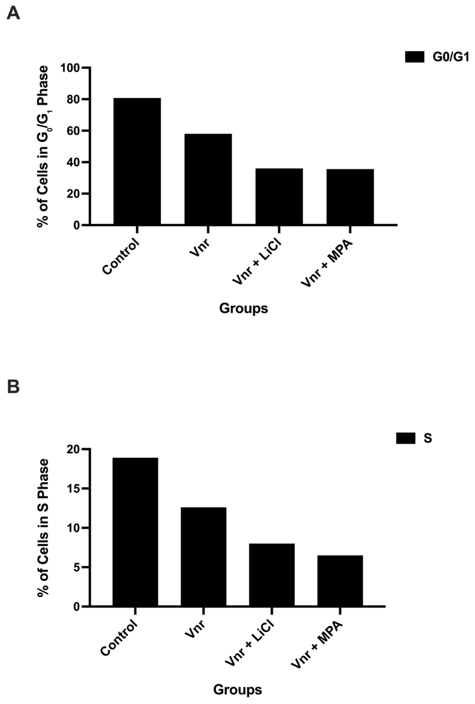 1 phase was highest in control spheroids and decreased across all treatment groups, with the lowest levels observed in the VNR + LiCl and VNR + MPA combinations. In contrast, S-phase populations were markedly reduced in all treated groups, declining to approximately 5–10%, particularly in combination treatments. Vinorelbine monotherapy produced intermediate effects, with partial reductions in S-phase entry. These quantitative findings indicate that vinorelbine-based treatments are associated with suppression of DNA synthesis and redistribution of cell cycle phases rather than a uniform increase in G