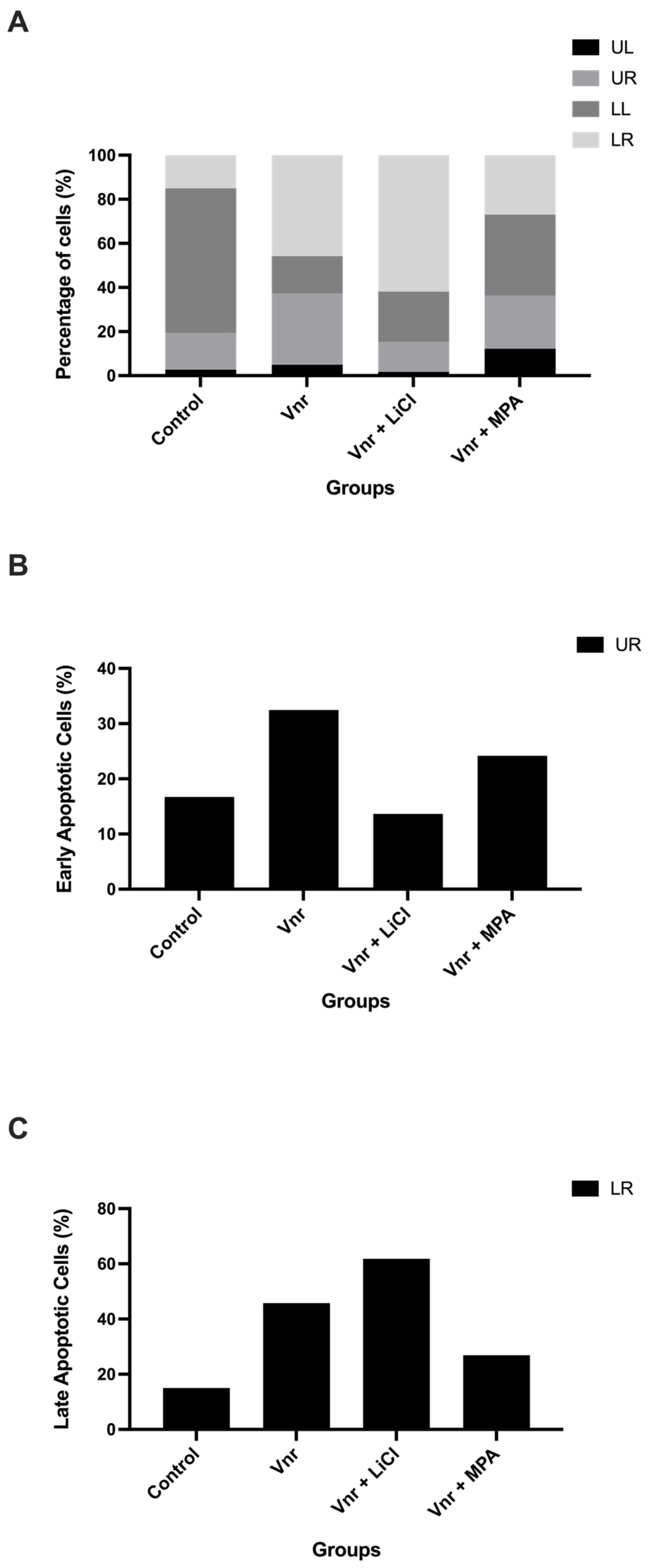 +; UR) populations compared with untreated controls. Quantitative analysis showed that vinorelbine treatment, either alone or in combination with LiCl or MPA, did not result in a consistent or statistically significant increase in apoptotic cell fractions across groups. Although some variability in early and late apoptotic populations was observed, these changes were not indicative of a dominant apoptotic response. These findings indicate that vinorelbine-based growth suppression in 3D spheroids occurs predominantly in the absence of robust classical apoptotic cell death, supporting a primarily cytostatic mechanism. Representative flow cytometry plots are provided in