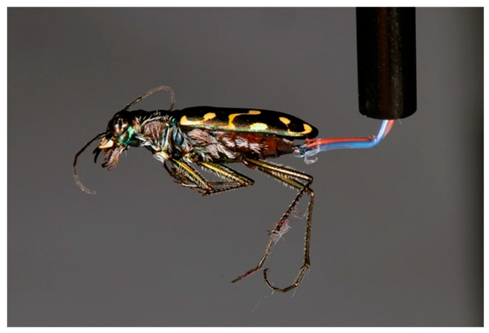 1], we inserted the exposed end of the thermocouple wire into each beetle through the genital opening. The wire extended up the length of each beetle abdomen without compromising the structure of the exoskeleton or penetrating the thorax (