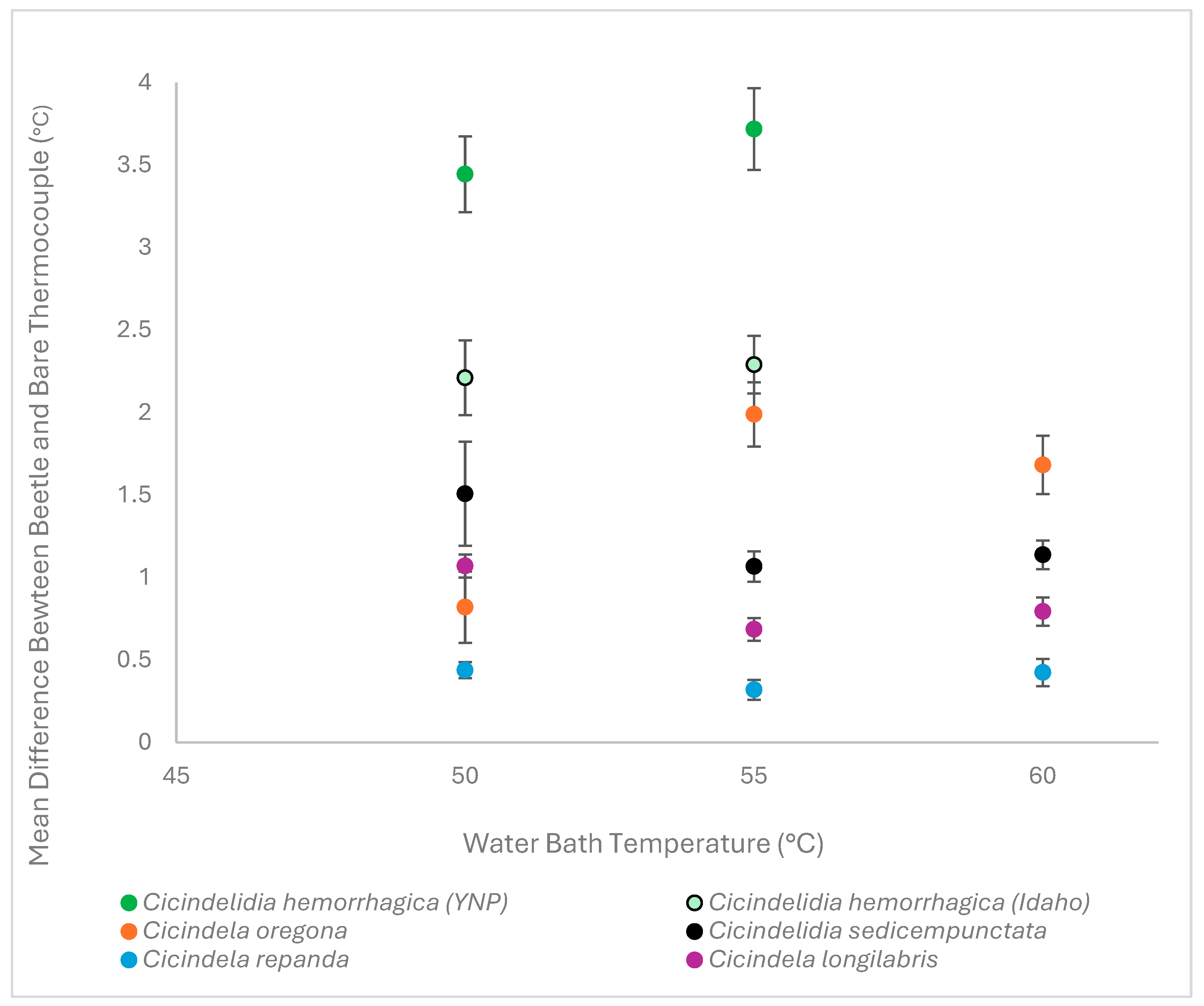 C. hemorrhagica from YNP and Idaho consisted of one beetle-loaded thermocouple from each population with a third bare thermocouple to continue to act as the control variable. The procedure for preparing these experiments was the same, but beetles were exposed to water bath temperatures of 45 °C, 50 °C, and 55 °C. Therefore, we were only able to use this species when comparing the results of the 50 °C and 55 °C experiments.