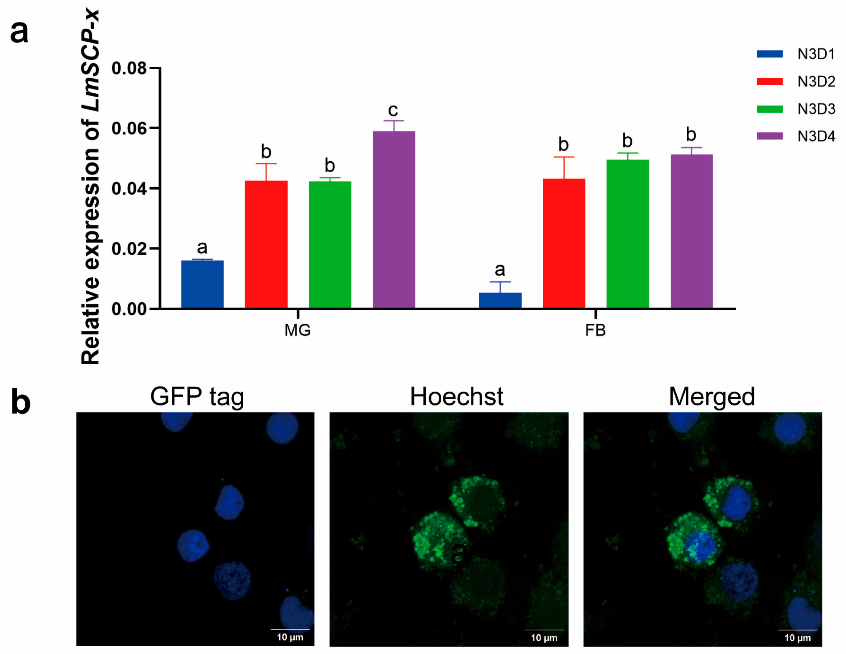 2.7. Immunofluorescence Detection of LmSCP-x in Tissue Sections