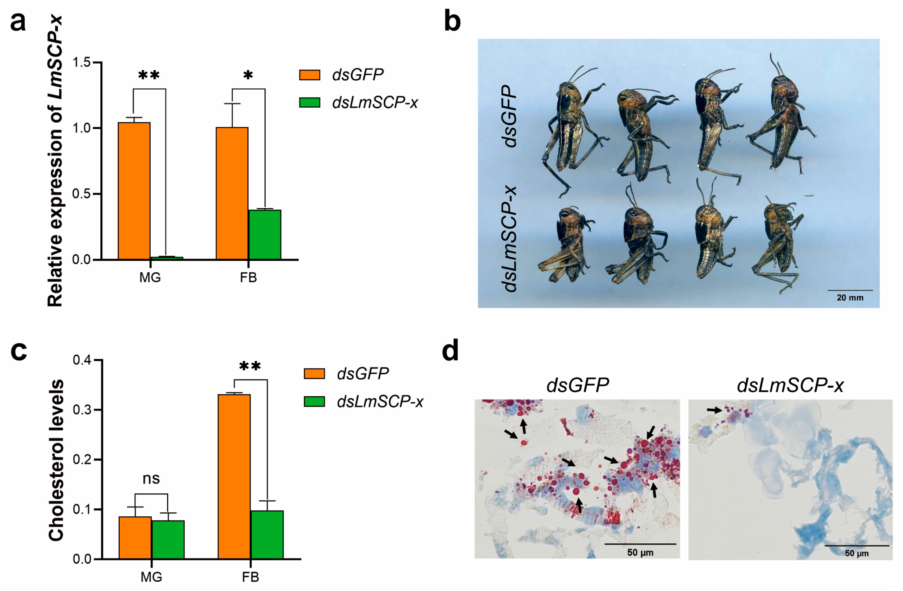 3.4. LmSCP-x Is Involved in Cholesterol Absorption and Transport in Locusts