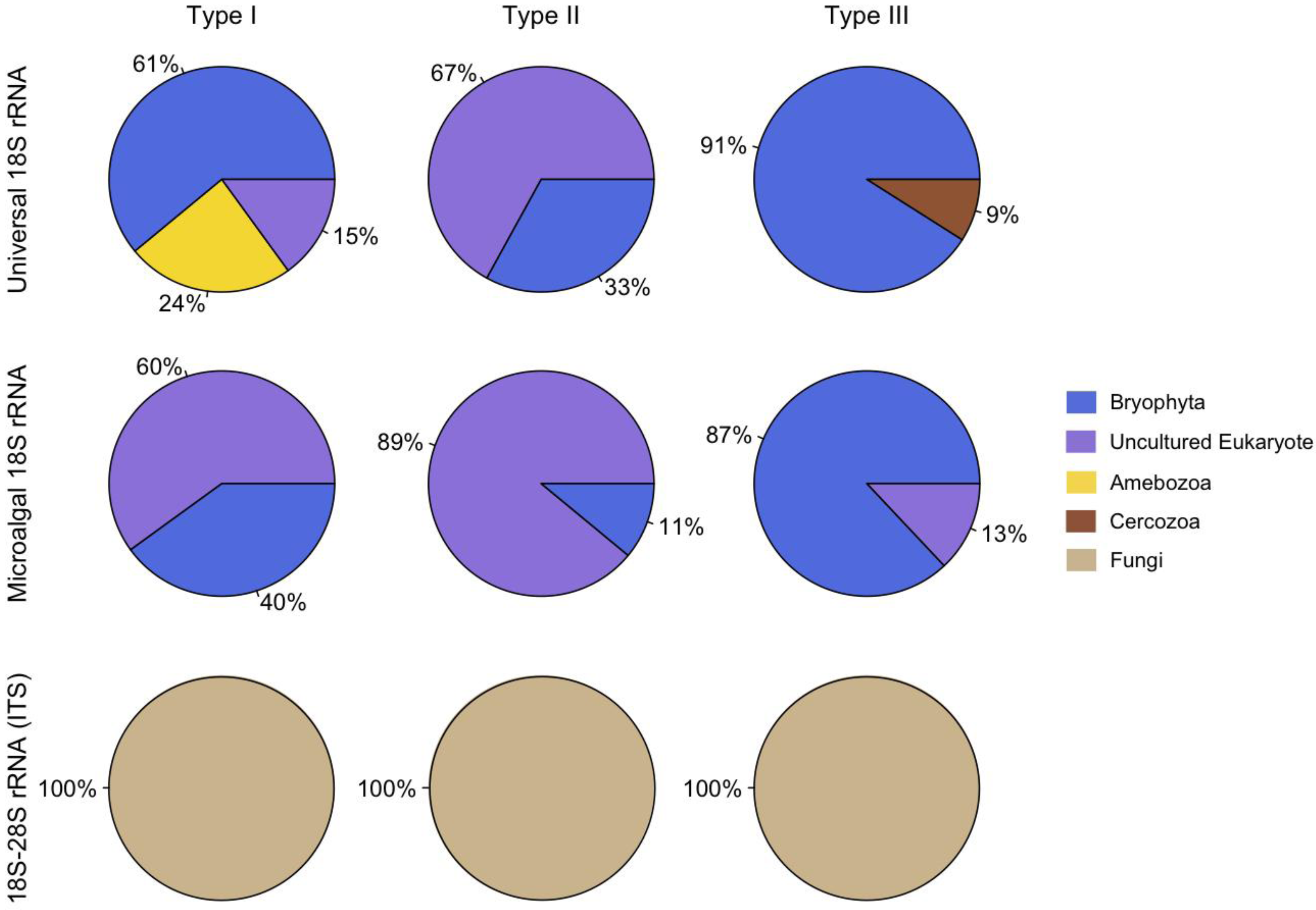 In an earlier study [11] we characterized the bacterial and eukaryotic phylogenetic diversity of two hypolith types: Type I (cyanobacteria-dominated) and Type III (moss-dominated). Here, we extend this research to Type II hypolithons (fungal-dominated) with a focus on the micro-eukaryotic communities. We also compare all three types of eukaryal communities in terms of habitat preferences.