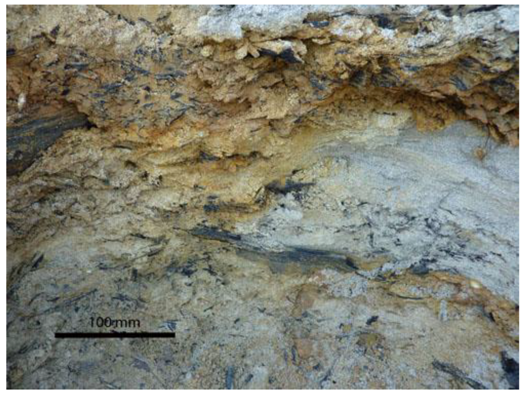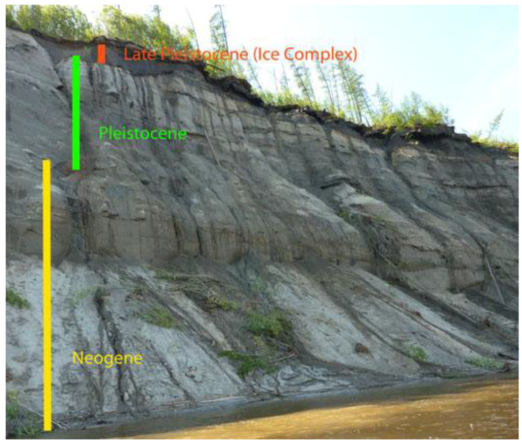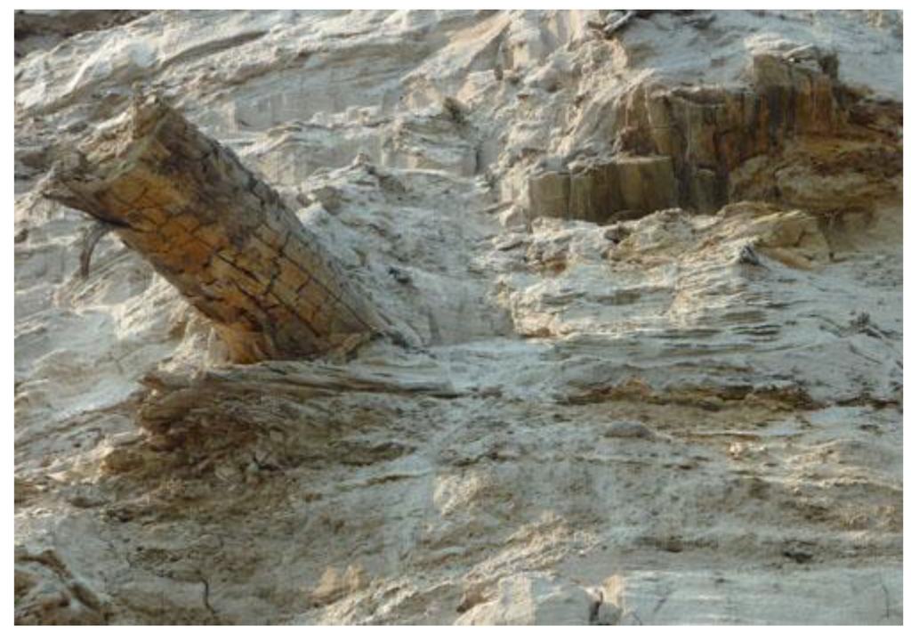 The exposure has three visible major ancient layers that can be attributed to Late Pleistocene (about 15,000–40,000 years old Ice Complex), Middle and Early Pleistocene (sands and clay; 0.1–1 million years old, frozen at the time of formation) and Neogene (Miocene and Pliocene), mostly sand formations, frozen probably at the end of Neogene about 3.5 million years ago (Figure 1 and Figure 2). A slightly decomposed frozen trunk (Figure 3) was found about 15 m above river level in the Middle Miocene deposits. The topsoil on the exposure, an active layer of about 0.9–1 m, is of modern age and consisted of (acidic) raw humus on frozen siliceous sand and silt and was covered with vegetation that consisted of birch, alder, conifers (spruce, larch and pine tree) and shrubs.