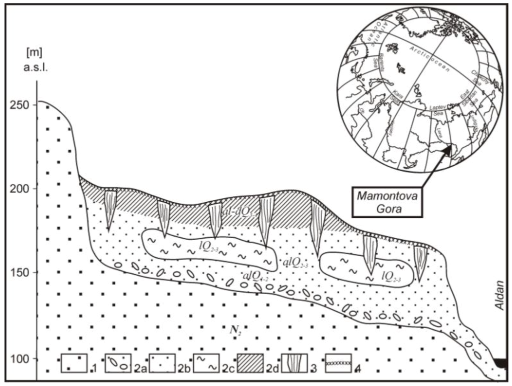 Profile of the exposure of the Mammoth Mountain: 1, Neogene sands; 2, Pleistocene sediment: a, pebbles in the ferrous sands; b, sands; c, lacustrine silt; d, silt; 3, ice wedge; 4, active layer (after data from Markov [36]).