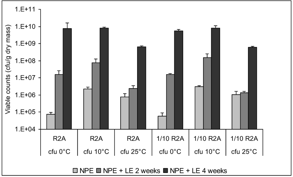 In contrast to numbers of viable bacteria, numbers of viable fungi were very low and were only detected on media incubated at 0 and 10 °C, but not at higher incubation temperatures. After NPE, 2–5 fungal colonies appeared on all three media used to detect viable fungi. Colonies with the same appearance (color, size) also appeared after two and four weeks of LE in the presence of nutrients. The techniques applied in this study for the recovery of viable fungi might be limited since NPE was originally developed for bacteria, and subsequent LE might have favored bacteria rather than fungi.