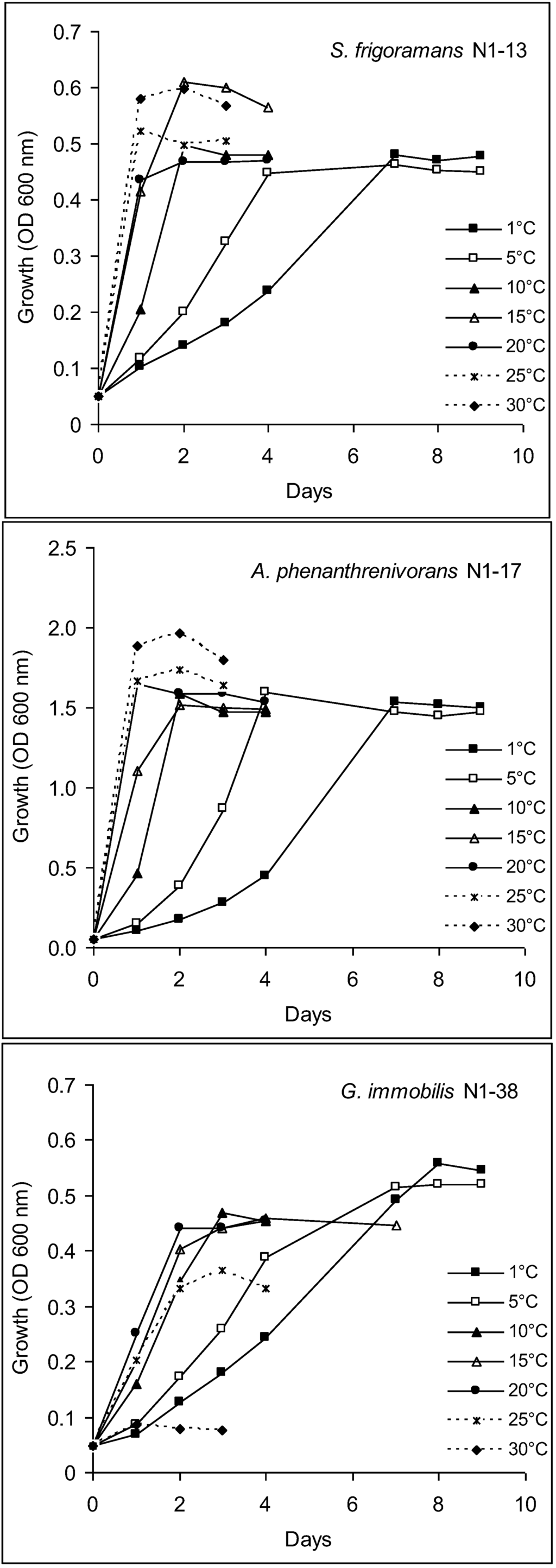Growth at −5, 1, 5, 10, 15, 20, 25, 30 and 35 °C was assessed on R2A agar and in R2A broth at 150 rpm (except for cultures at −5 °C where shaking was not possible), using two replicates per strain and temperature. Growth on agar plates was regularly monitored up to an incubation time of 28 days; growth in liquid cultures was monitored by measuring regularly OD600.