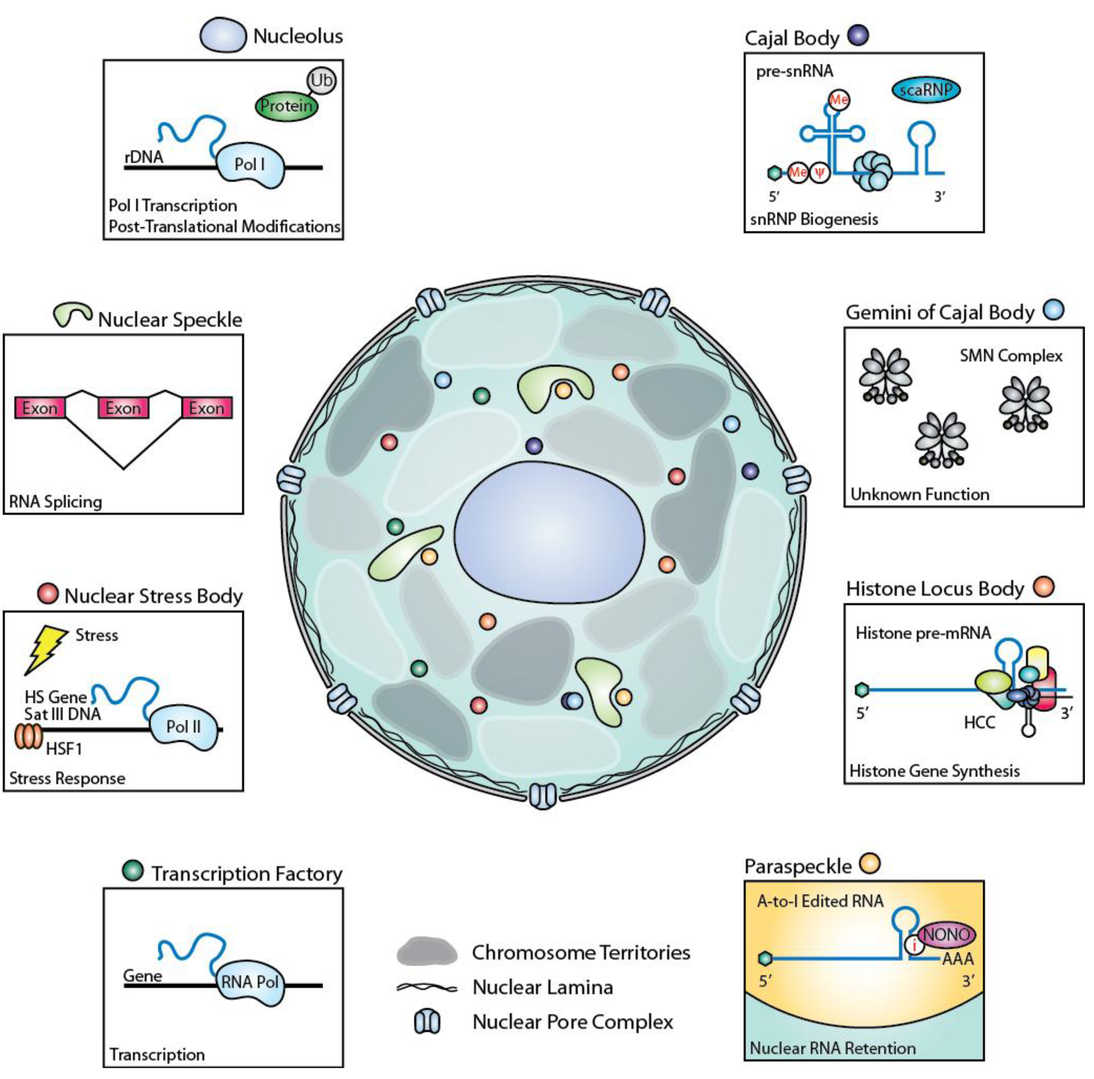 In this review, we focus on the role of nuclear bodies in gene regulation and discuss human diseases associated with mutations in genes encoding for key components. A review of the perinucleolar compartment is deferred, since it has so far only been identified in cancerous cells, and its relevance to general biology remains unclear. Additionally, although the promyelocytic leukemia (PML) body, the clastosome, the cleavage body, the Oct1/PTF/transcription (OPT) domain, the polymorphic interphase karyosomal association (PIKA) domain and the polycomb group (PcG) body contribute to the regulation of gene expression [4,5], these are not reviewed, because of the limited available information.