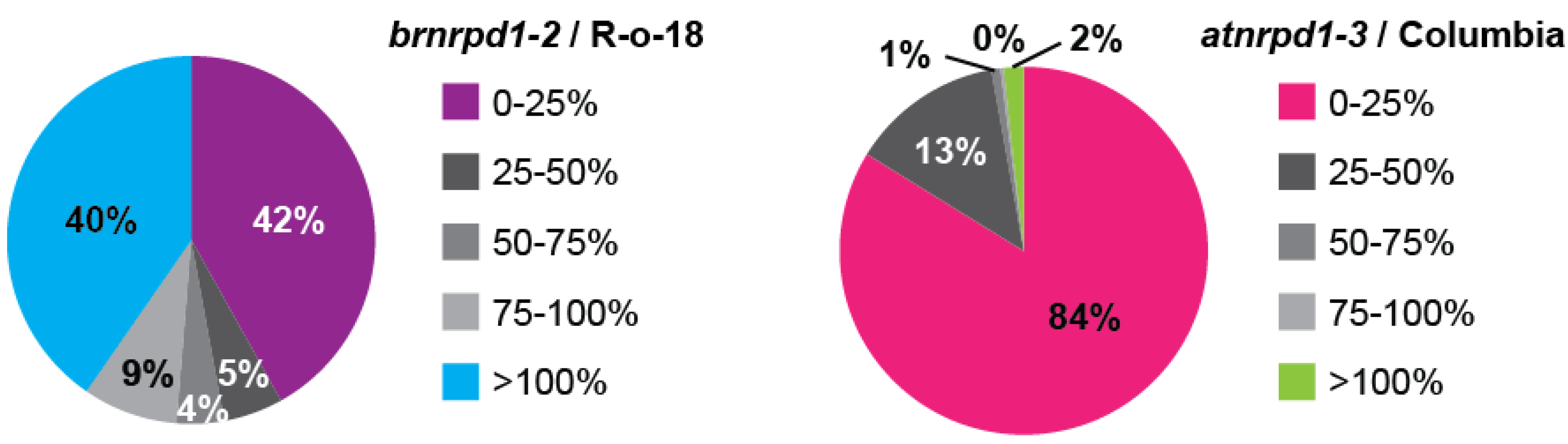 Figure 6. Pol IV-dependent siRNA loci in B. rapa and Arabidopsis. Small RNA-generating windows were divided into five groups based on the degree of sRNA accumulation in the brnrpd1-2 or atnrpd1-3 mutants compared to respective wild types. Pie charts display the proportion of sRNA-generating windows falling into each Pol IV-dependency group (n = 2,317 for B. rapa, 10,305 for Arabidopsis).