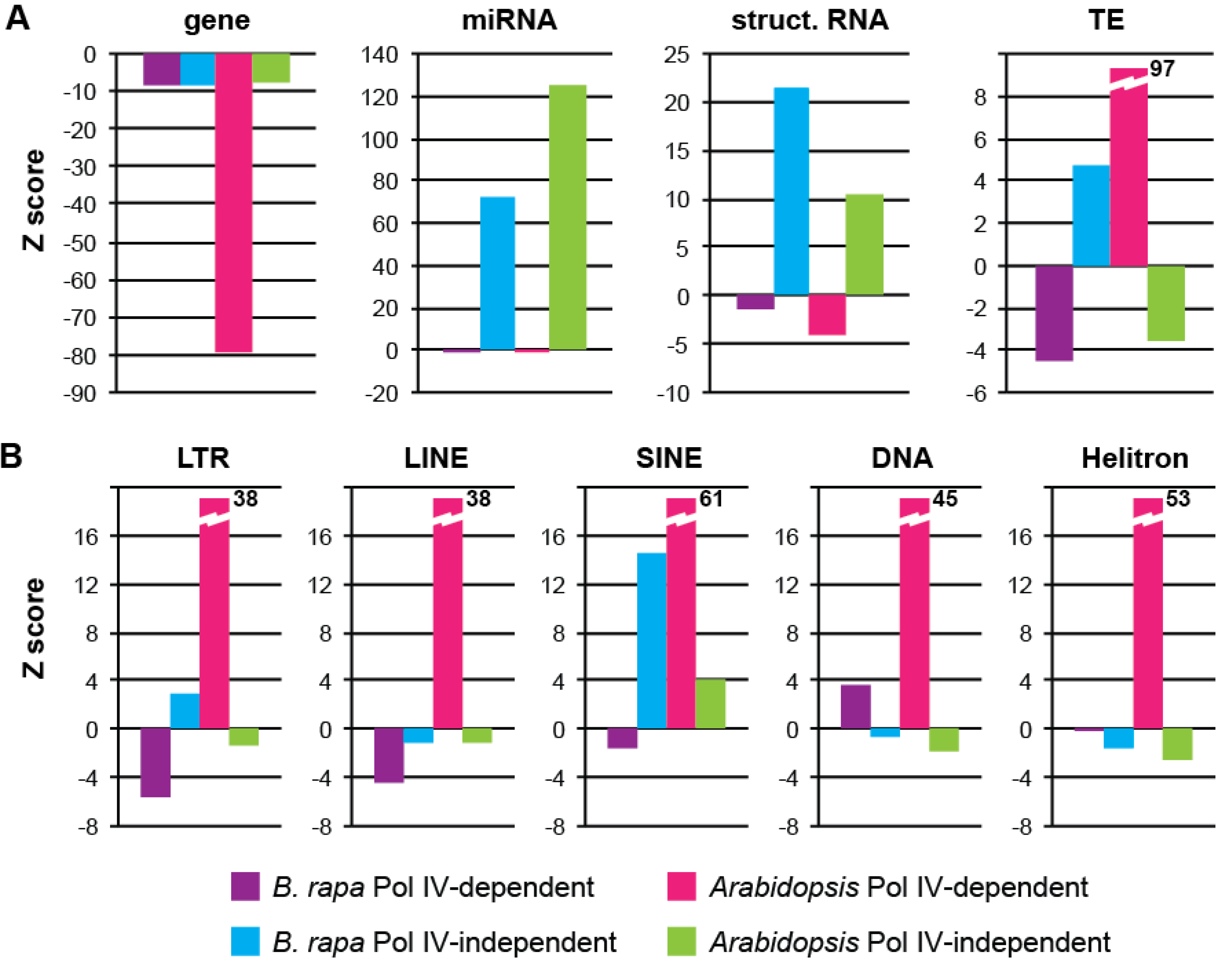 Annotations from each window were collected to assess which genomic features are associated with Pol IV-dependent and Pol IV-independent sRNA production in B. rapa (Supplementary Figure S4). Genes are moderately underrepresented in both Pol IV-dependent and Pol IV-independent loci, while microRNAs and windows overlapping structural RNA genes (rRNA, tRNA, snRNA) are overrepresented only among Pol IV-independent loci (Figure 7A). Similar patterns are seen at Arabidopsis Pol IV-independent and Pol IV-dependent loci, although genes are more highly depleted in Pol IV-dependent loci. Surprisingly, TEs are slightly underrepresented among B. rapa Pol IV-dependent loci and slightly over-represented among Pol IV-independent loci. This is opposite of the pattern detected in Arabidopsis and predicted by models of Pol IV function.