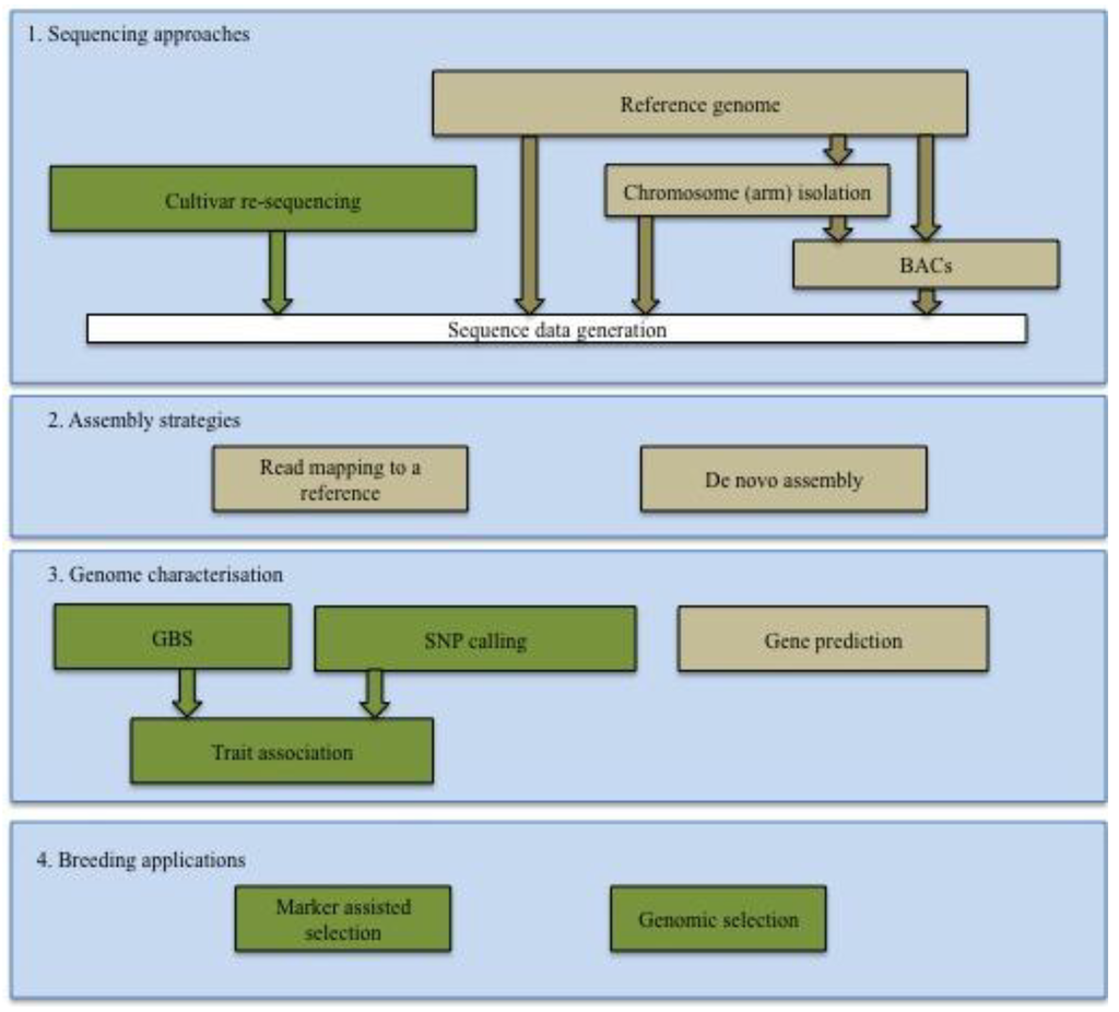 Cereals constitute over 60% of the world’s food sources. In the African continent, cereals comprise 46% of the diet, roots and tubers 20% and animal products 7%, while in Western Europe these constitute 26%, 20% and 4%, respectively (www.FAOstat.fao.org). The importance of cereals can be attributed to their phenotypic plasticity, enabling them to adapt to various climatic conditions. Several of the major cereal genomes are large and complex, mainly due to an abundance of transposable elements (TEs), and polyploidy [1,2]. As a result, genetic analysis of diversity, allele and haplotype frequencies is a challenge. Traditional breeding practices rely on phenotypic selection with cycles of 5–12 years depending on the crop and breeding system, however more rapid selection systems are urgently required to develop cereal varieties that are high yielding and resilient to floods, droughts and high or low temperatures to feed the growing world population in the face of climate change. The field of genomics is accelerating through the development and application of Next Generation Sequencing (NGS) technologies coupled with advanced computational algorithms and statistics. The cheaper per base cost of NGS compared to traditional Sanger sequencing comes at a cost of shorter read lengths and reduced accuracy, but offers the potential for increased depth of coverage required for confident variant discovery [3,4]. A summary of genomic approaches for crop improvement is presented in Figure 1.