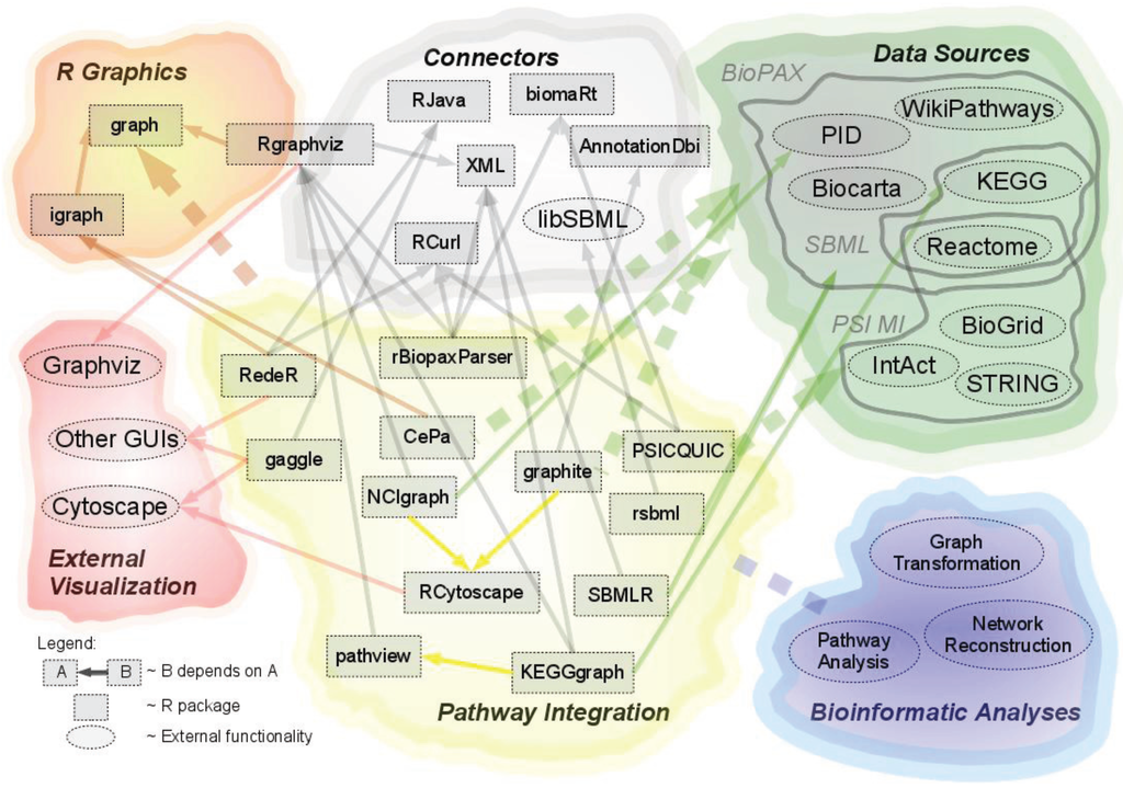 | graphite | includes KEGG, BioCarta, PID, Reactome, SPIKE | gene sets, directed graphs, mapping and converting IDs | AnnotationDbi | Pathway analyses: clipper, SPIA | Cytoscape |