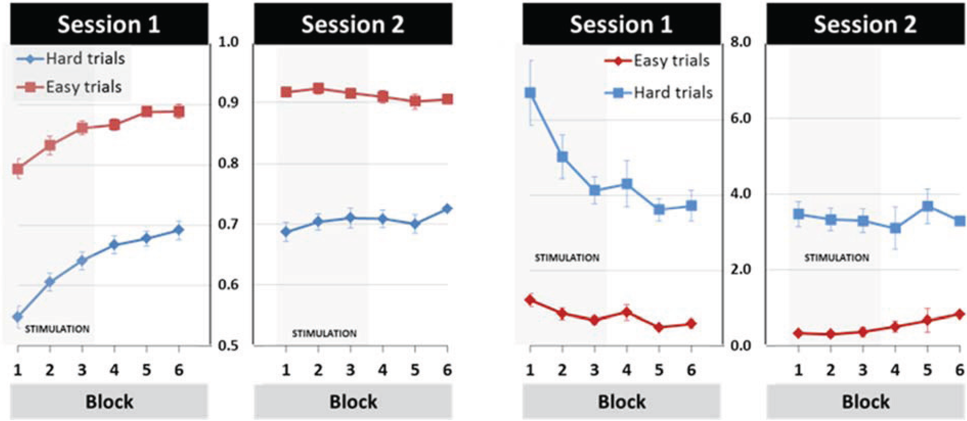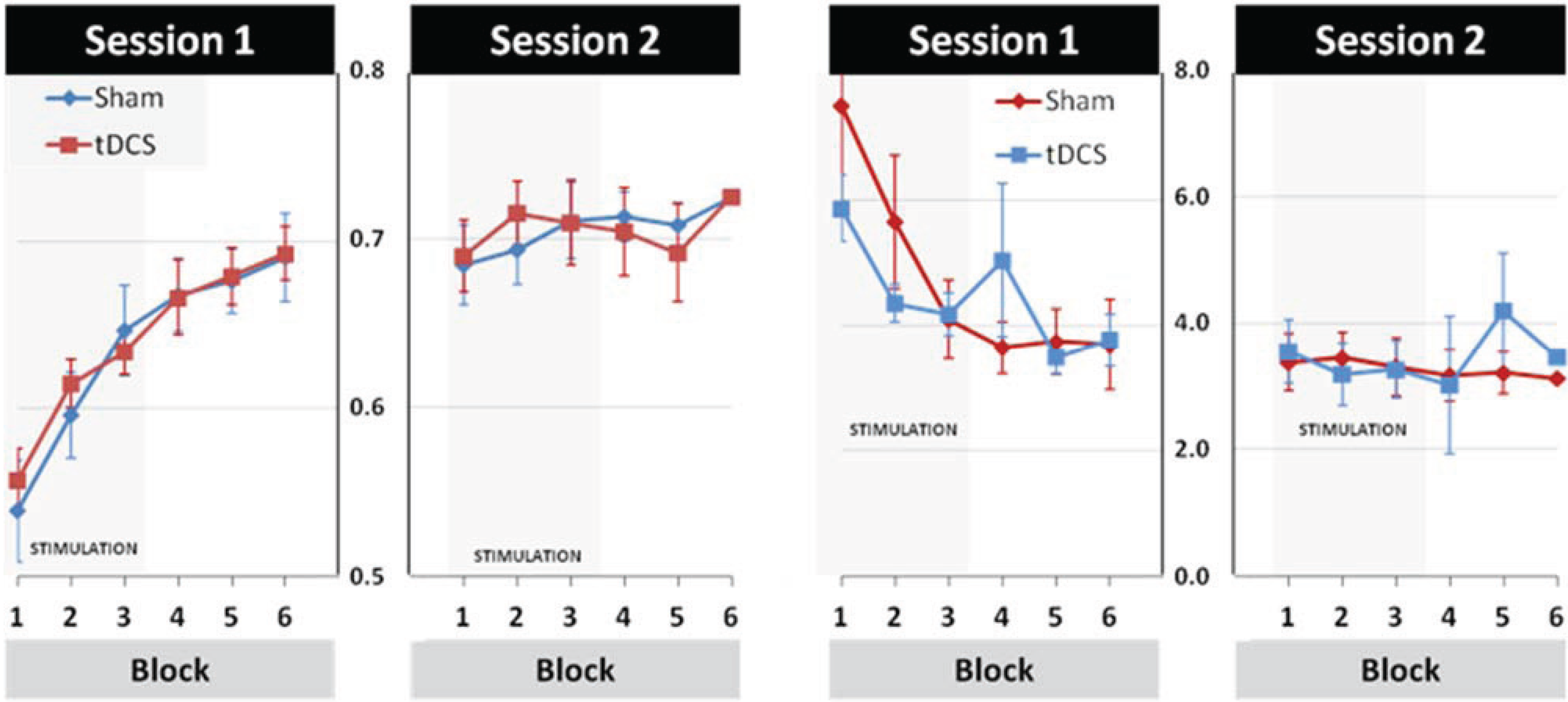 3.2. Modulation of Learning and Performance by tDCS Stimulation
