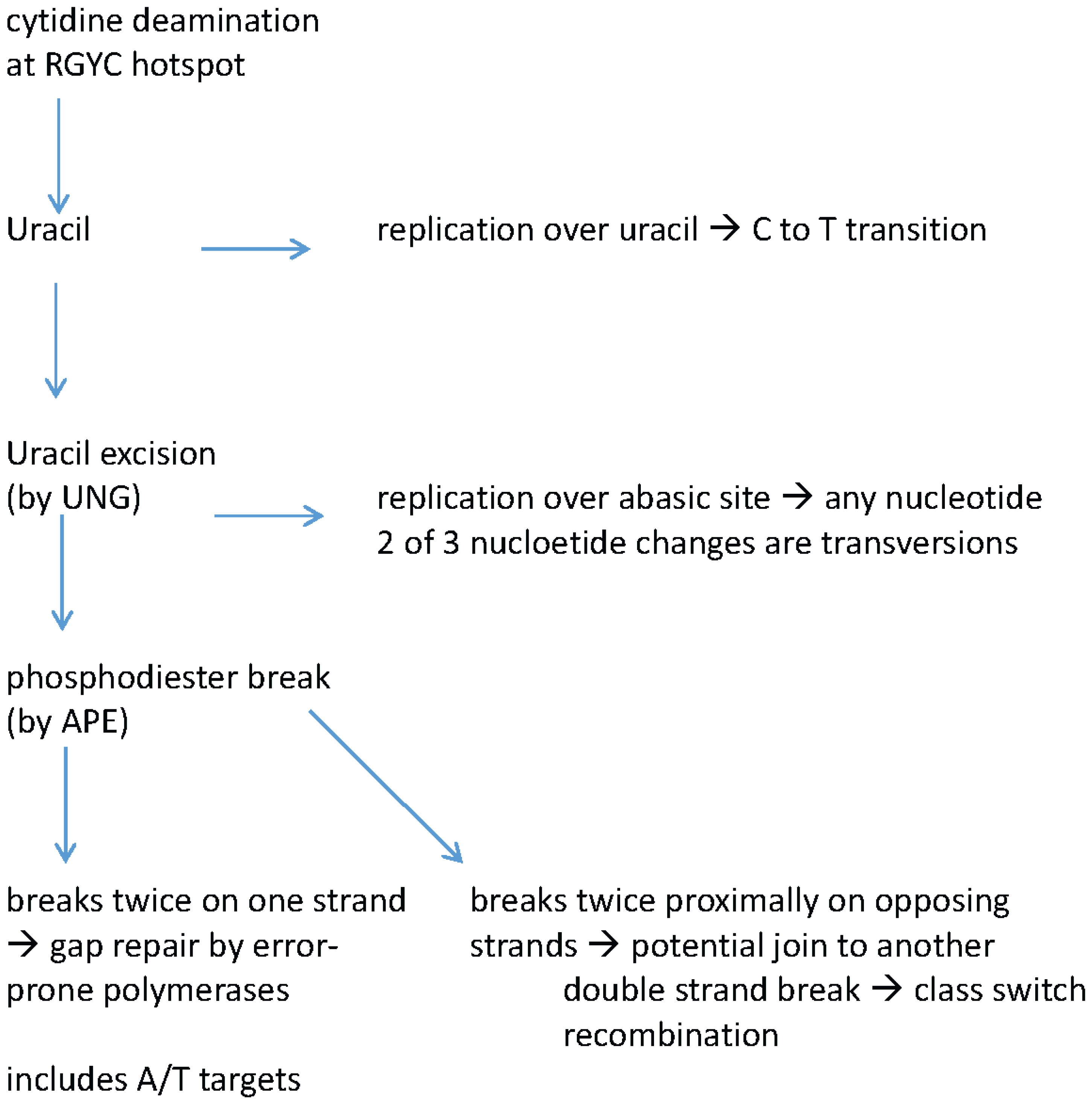 Schematic of outcomes of activation induced cytidine deaminase (AID) mediated cytidine deaminations in immunoglobulin genes. AID targets cytidines within the RGYW hotspot motif. UNG—Uracil-DNA-glycosylase; APE—apurinic/apyrimidinic endonuclease.