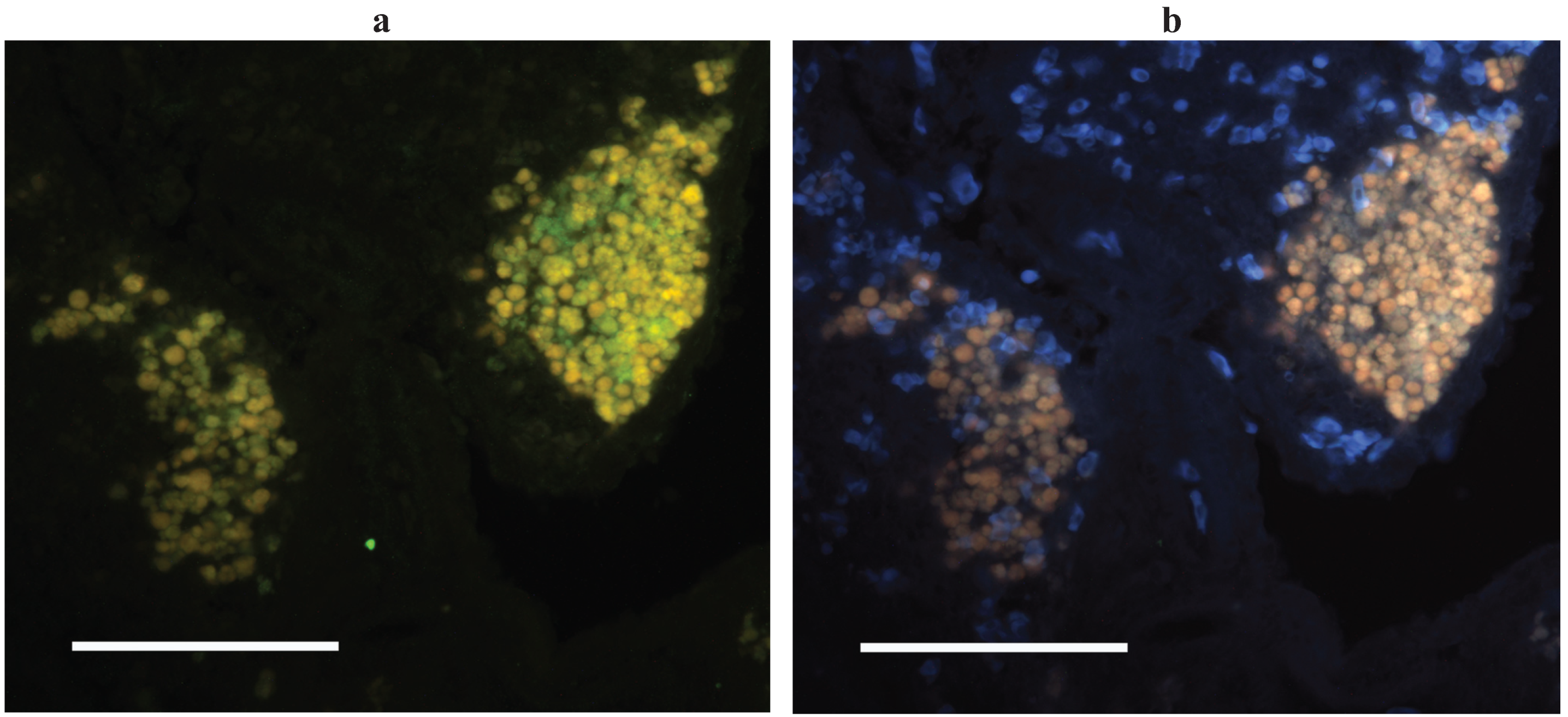 AID expressing cells in channel catfish spleen. (a) In situ hybridization with AID anti-sense probe (green) under excitation for FITC. Melanomacrophages autofluoresce yellow; (b) UV excitation elicits orange/brown autofluorescence of only melanomacrophages (and RBCs in blue). Methods are as described in [28].