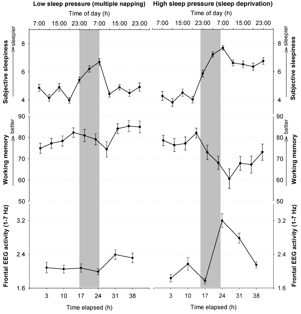 The impact of sleep pressure on working memory (WM) performance and its underlying cerebral correlates has repeatedly been investigated (see [10] for overview). Studies indicate that WM functions do not simply decline with rising sleep pressure, but are differentially regulated by factors interacting with the sleep homeostatic process, such as inter-individual differences (e.g., in genetic polymorphisms [11,12,13,14], age (for overview, see [15])) or time of day ([16,17,18,19,20,21], but see [22,23]). After summarizing evidence about circadian and sleep-homeostatic, in particular adenosinergic mechanisms on electroencephalographic (EEG), hormonal and subjective sleepiness data, we will specifically review the current knowledge about the regulation of WM performance and the underlying neuronal mechanisms.