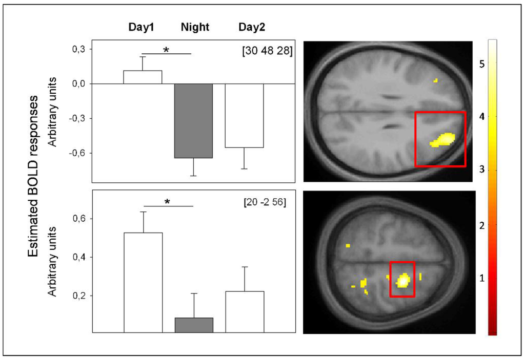 BOLD activity underlying successful WM during total SD. BOLD activity was assessed during hit targets in a 3-back task after 13 h (Day 1), 21 h (Night) and 37 h (Day 2) of continuous wakefulness in constant posture and lightning conditions. From a circadian perspective, these time windows encompass maximal promotion of wakefulness (Day 1, Day 2) and sleep (Night). Left: Significant changes in estimated BOLD responses in frontal brain regions. Right: Location of significant changes in estimated BOLD response, highlighted by red rectangles on mean structural imgages. * p < 0.01; p-value at peak-level after family-wise error correction (FWE), applied on a mask encompassing brain regions typically underlying n-back performance according to [146]. We did not find any other significant BOLD activity changes. Coordinates (x, y, z) are expressed in mm in the Montreal Neurological Institute (MNI) space, (unpublished data) [193].