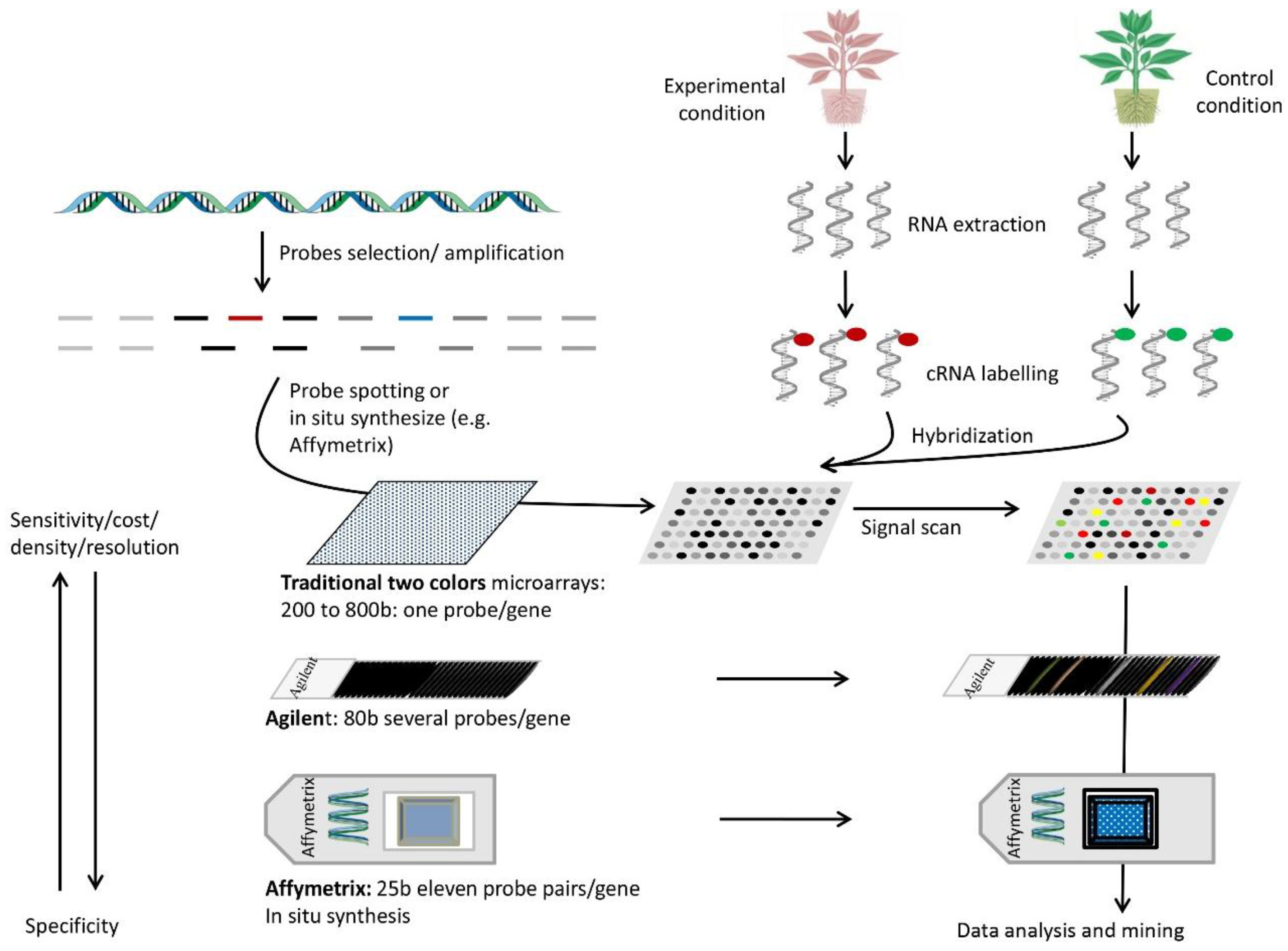 Figure 1 illustrates the general principle of key microarray methods. There are two main components in a DNA array approach: (1) the support (membrane or glass chip) on which probes are fixed, and (2) the preparation of RNA samples to be hybridized on the support. Several companies, such as Agilent and Affymetrix, provide custom-made supports spotted with a given number of probes. Supports can also be constructed in the laboratory for a defined purpose. For instance, a chip was constructed with sequences of grape genes potentially involved in dormancy [72]. Depending on the type of support being used (i.e., beads and glass slides for high density, and plastic membranes for low-density analyses), hundreds to tens of thousands of probes can be printed on DNA arrays and performed in parallel or successively. The lengths of probes printed or synthesized in situ vary from short DNA sequences (for e.g., oligonucleotides ranging from 20 to 60 bases) to long DNA fragments (~200 to 500 bases).