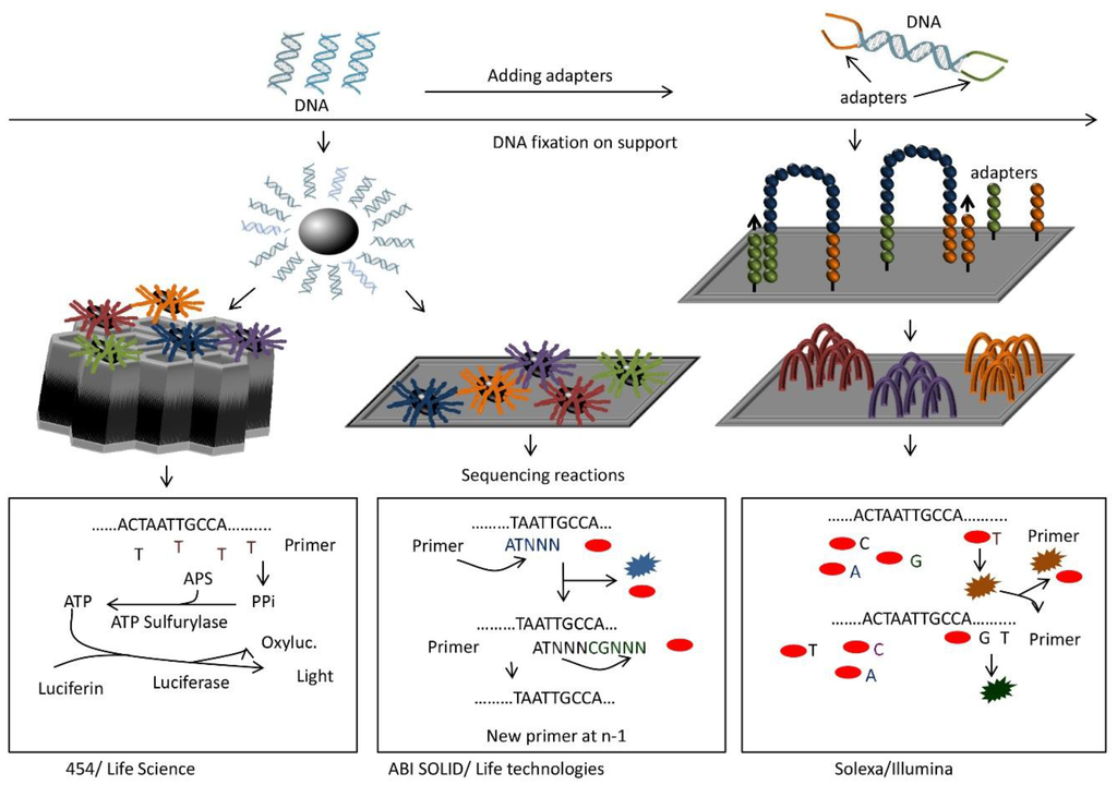 The principle of next-generation sequencing (Figure 2) is similar to the “previous” sequencing generation (Sanger and capillarity electrophoresis), based on the synthesis of DNA strands complementary to the strand to be sequenced. The main difference is that, in the first sequencing generations, only one DNA fragment is sequenced while in NGS the process is extended to millions of fragments in parallel. In Illumina sequencing systems, the DNA (or cDNA) to be sequenced is randomly fragmented and mixed with adapters that bind to 3′ and 5′ ends (library preparation). The adapted fragments are then captured on surface-bound oligos complementary to the adapters. The fragments are next amplified in the presence of fluorescently labeled deoxyribonuceotide triphosphates (dNTP) that will be incorporated into the DNA template by DNA polymerase during sequential cycles of DNA synthesis (complementary DNA strands). At the point of nucleotide incorporation, each nucleotide is excited and identified. The identified reads are then aligned to a reference genome and analyzed for mutations, single nucleotide polymorphism (SNP), RNA abundance, or phylogenetic analysis, etc.