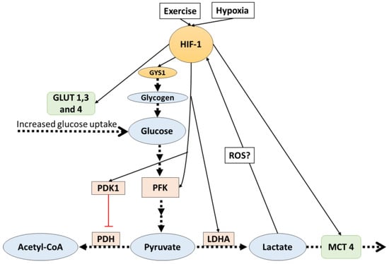 The regulation of lactate production has also been shown to be indirectly favored by HIF-1 activity. HIF-1 promotes the expression of glycolytic genes that encode the enzyme PFK, the glucose transporters GLUT1-3 in different cultured cells [30,31,32,33], and the GLUT4 translocation in C2C12 myocytes [30]. PFK is the key enzyme of glycolysis and increased levels are associated with higher muscle glycolytic capacity and therefore upregulated lactate production. GLUT1-3-4, which are the glucose transporters in the cell membrane, also favor glycolysis by augmenting glucose transport into the cell. Additionally, in C2C12 myotubes, HIF-1 regulated glycogen synthesis by regulating the expression of the GYS1 gene [34], a gene that is responsible for the synthesis of glycogen synthase. Furthermore, the expression of UGP2 and GBE1 (genes that are in charge of the rest of the enzymes needed for glycogen synthesis) were also induced by hypoxia, but it is still unknown if the expression of these genes is also HIF-1-dependent [34]. It should be noted that the primary limiting factors for glycogen synthesis (apart from substrates availability) is the activity level of glycogen synthase [35], which is upregulated by insulin [36] and glucose 6 phosphate [37], and inhibited by glycogen levels [38]. At the moment, there is no evidence suggesting that a HIF-1-mediated mechanism increases the activity of glycogen synthase.