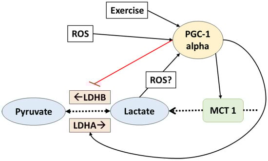PGC1-alpha controls lactate transport and homeostasis. Lactate also affects PGC1-alpha. The dotted arrows indicate transport and reactions; solid lines indicate increased (black) or inhibit (red) gene expression. ROS: reactive oxygen species; PGC1-alpha: peroxisome proliferator activated receptor gamma coactivator-1 alpha; LDHA/B: lactate dehydrogenase A/B; MCT1: monocarboxylate transporter 1.