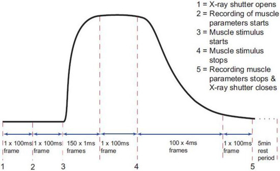 Diagram of the timing protocol used for time-resolved X-ray diffraction experiments. Black trace: a diagrammatic representation of the tetanic tension record produced by an isometrically contracting muscle showing the exposure times for the X-ray diffraction patterns taken throughout the contraction (red dashed lines). The numbers 1 to 5 indicate points where an action occurs as in the top right hand corner of the figure. X-ray data and ionisation chamber readings were recorded throughout. The other muscle parameters such as the muscle tension, change in length and sarcomere length (SL) were only recorded between 2 and 5.