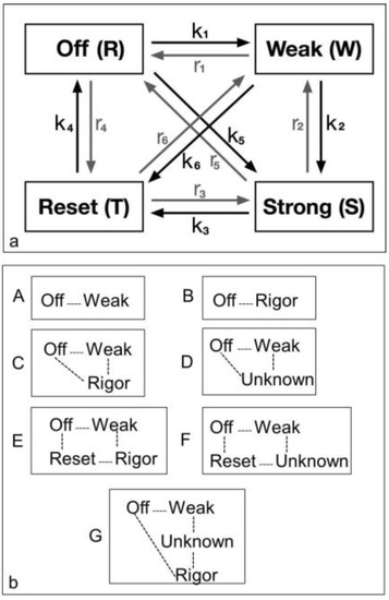 Possible models for the crossbridge cycle including 4 or fewer structural states and the transitions between them. For convenience the states have been given names. (a) A general model for the crossbridge cycle including four possible states and transitions between them. However, they can be considered in different ways as in (b); (b) Various kinds of model (A to G) have been considered as described in the text. These include two 2-state models (A, B), two 3-state models (C, D) and three 4-state models (E, F, G).