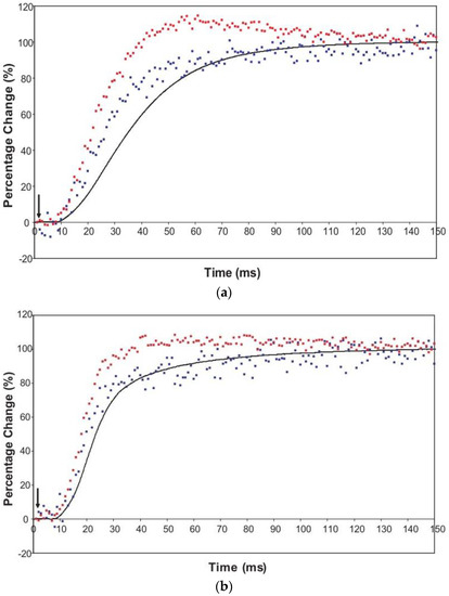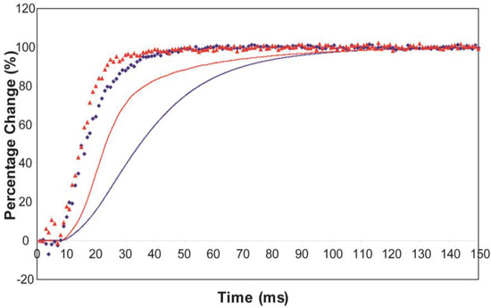 Analysis of the time-resolved X-ray data was carried out using the programs FibreFix version 1.3 [72,73] and Peakfit version 4 from AISN Software Inc. (Florence, OR, USA). The counts recorded by the X-ray detector for each pixel in the pattern are proportional to the intensity of the X-rays incident on that pixel.