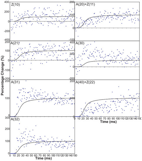 where the sum extended over the whole time course (t = 1, …, 150 ms). w10, ..., w40 are weight factors appropriately chosen to correct for the intrinsic noise and reduced reliability of the higher order reflections.