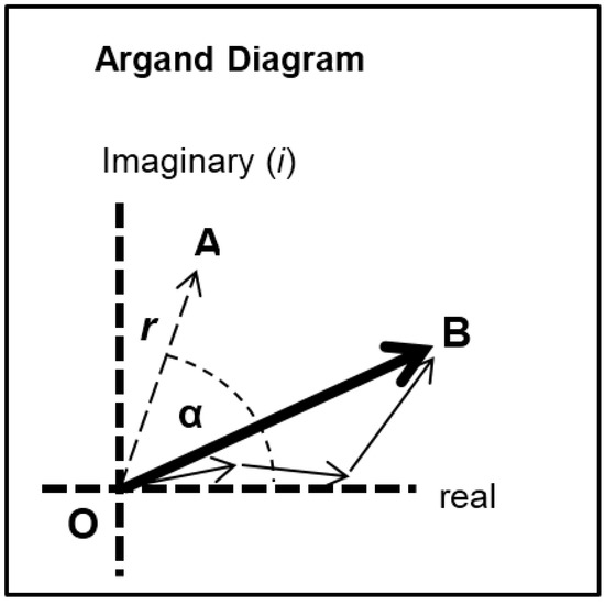Diagram illustrating the addition of vectors in an Argand diagram. Here any vector such as OA has an amplitude (the arrow length) and a phase (α). In the muscle case for each equatorial reflection each crossbridge state will contribute a vector (the smaller arrows) which will add vectorially to give the resultant OB. If the structure is centrosymmetric then the arrows will all point along the horizontal (real) axis (their phase is 0° or 180°) and they just need to be added or subtracted.