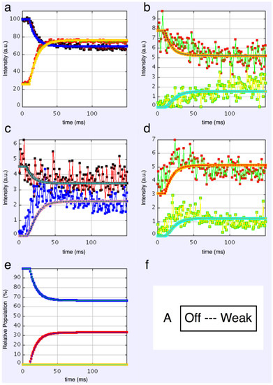 The best values for all unknown parameters were found by fitting the time course by a simulating annealing fitting process [75]. Using the notation I10ex(t) to indicate the intensity of the (10) reflection obtained experimentally at time t, and I10(t) the intensity calculated as described above (and using an analogous notation for all other reflections), the function to minimise during the simulated annealing process was: